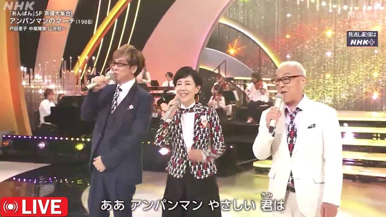 2025年8月9日放送のNHK特番「MUSIC GIFT 2025 ~あなたに贈ろう 希望の歌~」より、アニメ『それいけ!アンパンマン』のレジェンド声優、戸田恵子さん(アンパンマン役)、中尾隆聖さん(ばいきんまん役)、山寺宏一さん(チーズ・ジャムおじさん・カバオくん役)が奇跡の共演!名曲『アンパンマンのマーチ』を感動的に歌い上げた一夜限りのステージです。