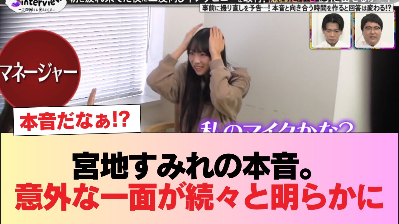みやちスミの本音な一面が続々と明らかに マネージャーと話してる元のすみれはなんかをさなくてちゃんと 10 代の等身台の女の子って感じなかなか表では見れない雰囲気でもっとすみれなこと知りたくなった。 このインタビューがすでにめっちゃくちゃ面白いんだがマナみんが楽屋ではクールに見えた理由も分かるね。 楽屋でクールに振るまってるのは案外間違いではないんだな。 楽屋のすみれさんってこんな感じなんだろうね。 1 位はともかく間違いなくメンバー内でトップレベルで面白い側のメンバーです。 すみれさんは4期生で1 番面白いと思いますよ。若林さんは夢中になるくらい。 すみれさんは狙ってボケられる貴重なタイプなのよ。ほとんどの人は思ったあなためちゃくちゃ面白いですよ。 自分の面白さが分かってない。 あんたとか堀りんのクール組が今のところ一番おもろいのよ。 キノコの山はさすがに草。でもそれが面白い。 ガ宿の大喜りで1 人だけザ布トンもらえなかったの悔でたしな。 すみれさん割と悩むタイプか。 すみさんはそのままで良いんだよ。 え、元のすみれめっちゃタイプ。本音だな。 炭は嫉妬深そうな感じではあるよね。 すみれさん重い