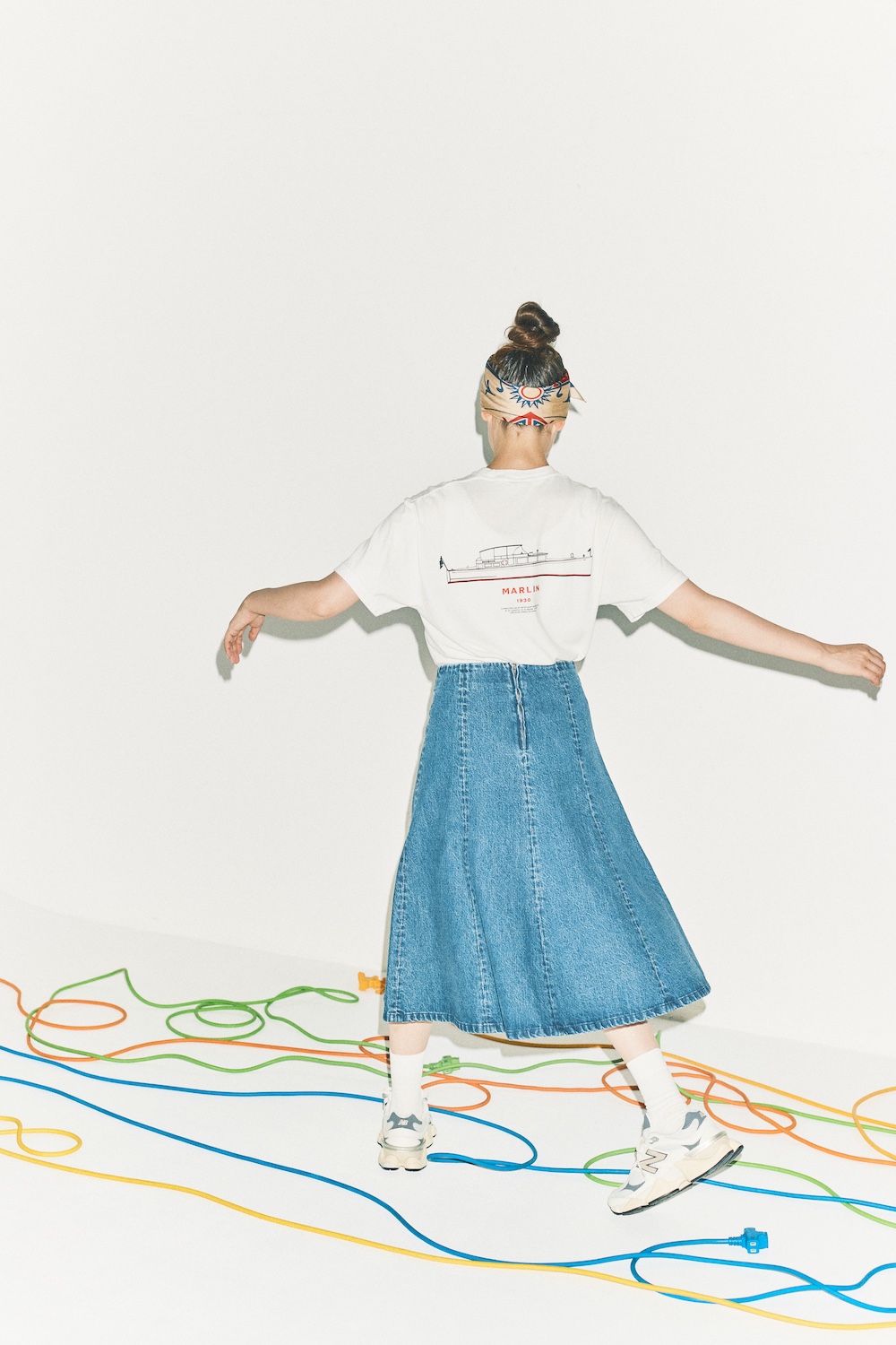 Tシャツ¥12100 / OLD SOLDIER(シンゾーン ルミネ新宿店)、スカーフ¥24200 / A Piece of Chic(グラストンベリーショールーム)、スカート¥45100、ソックス¥4950 / ともに A.P.C.(アー・ペー・セー カスタマーサービス)、スニーカー¥24200 / New Balance(ニューバランスジャパンお客様相談室)