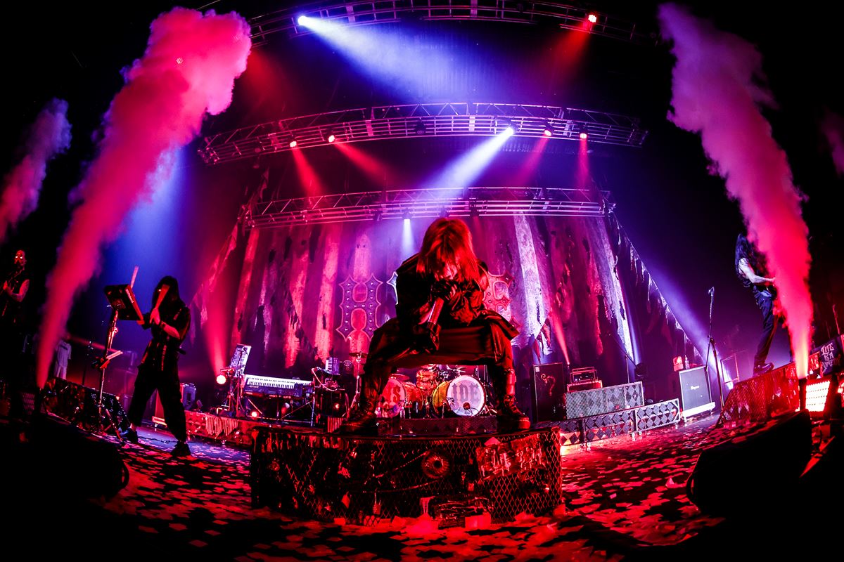両日ともにチケットはソールドアウトとあって、ステージ上手側フロアのBEAUTY(女性)エリアも下手側のBEAST(男性)エリアも開演前からすし詰め状態。俯瞰するに両サイドの体格差は歴然としているものの、ひしめく熱量は互いにひけを取っていない。この2日間のオープニングアクトを務めたASH DA HEROによる全身全霊のパフォーマンスが逸る期待を否応なしに煽り、そうして迎えた開演時刻。ゆっくりと開いた黒幕の向こうに高くそびえる演説台と、その頂からオーディエンスを睥睨するHYDEが姿を現すや、黄色い嬌声と野太き歓声が一斉に噴き上がった。待ってましたとばかり、ステージめがけて一気呵成になだれを打つのが目に見えるかのごとき凄まじさだ。
