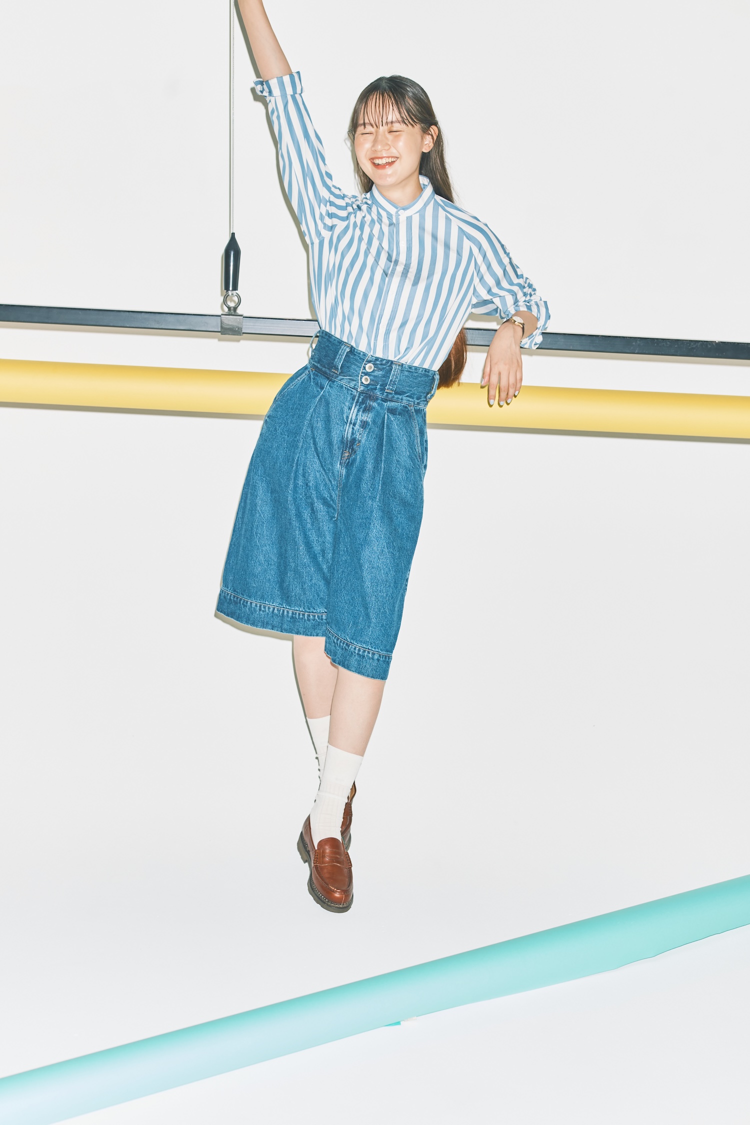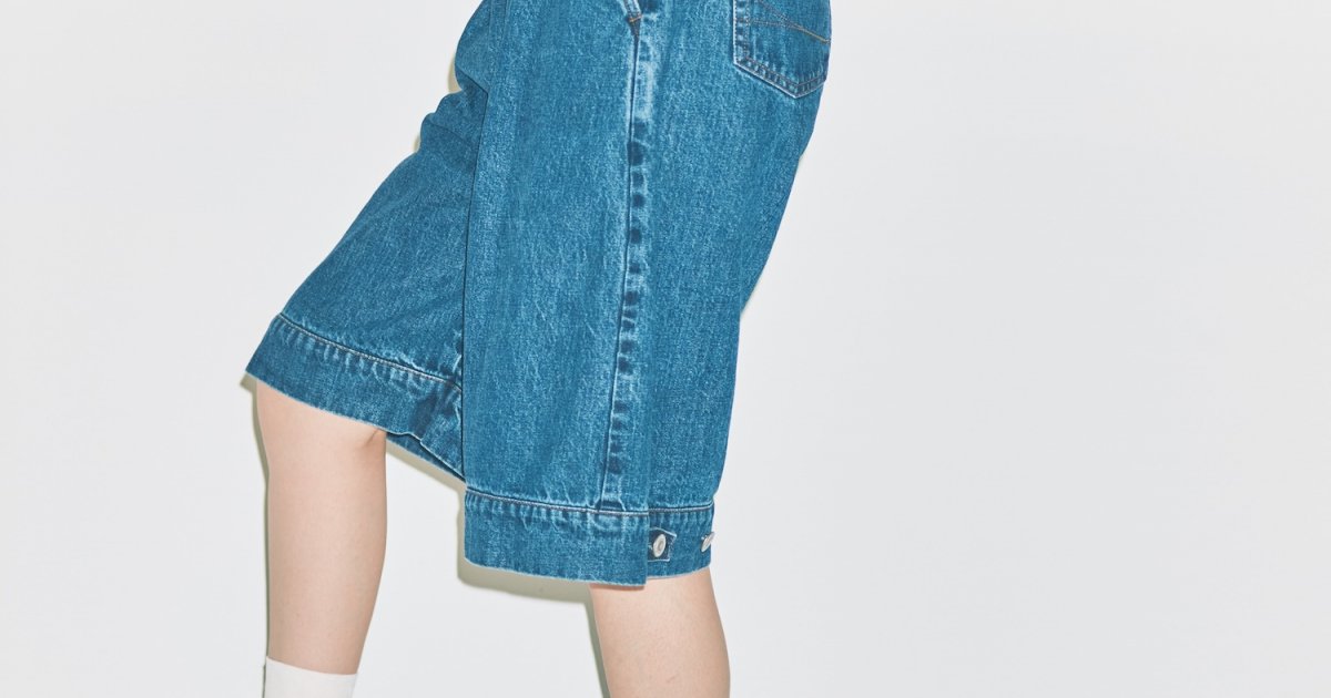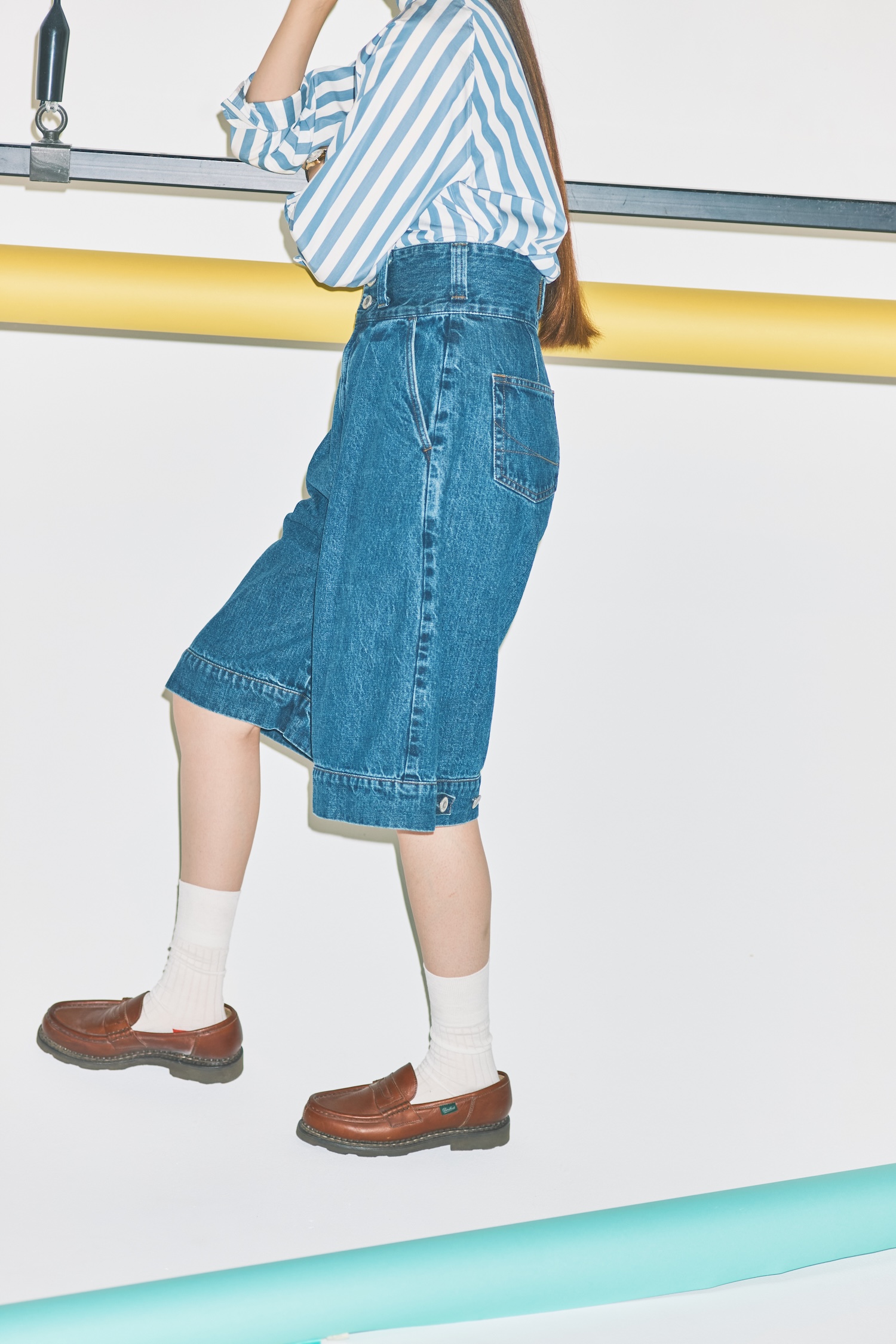 清涼感のあるストライプシャツに上品なカンカン帽、足元には定番のローファーを。パリジェンヌ気分で楽しむ夏スタイルに、新鮮さをプラスするのが、レングスを短くカットした《サムシング》のデニムショートパンツ。ボタン位置を変えればバルーンシルエットも楽しめる、遊び心あふれる一本は、後ろ姿まで愛らしい。