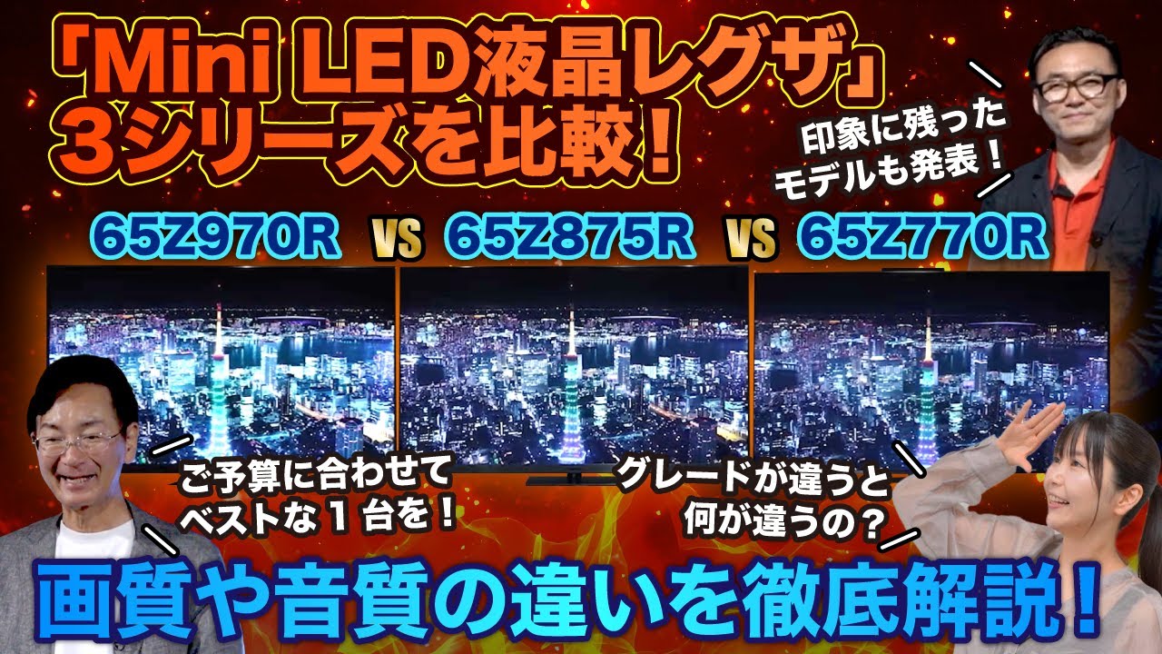今回は、レグザブランド統括マネージャーの本村裕史と声優の小岩井ことりさんが、4K Mini LEDレグザ3シリーズ、「Z970R」「Z875R」「Z770R」を徹底比較。