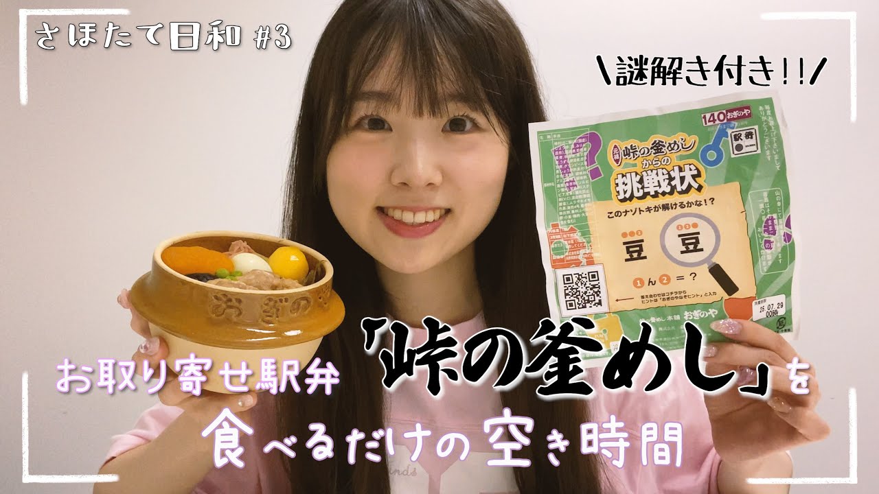 皆さんこんばんは。って言いたい時間なん です。私は、えっと、AKB48の20 周年記念ツアーがもうなく始まるんです けれど、それのリハが今日はまだこの後 ありまして、この秋時間に何をしようと 思った時にご飯が食べたいとなったわけ ですよ。で、ま、今日はちょっと特別な ものをご用意しました。なので早速紹介し たいと思います。 すごいフォれバッグに詰め込まれてる。何 が出てくるんでしょうか?ちょ、およ。 こちらです。じーん。 ちょっと陽器を見ておようと思った人も いらっしゃると思うのですが、峠のかま飯 を今日は持ってきちゃいました。うわーい 。 というわけで今日の企画は駅弁を食べ ながら秋き時間を潰そうです。 はい。なので色々食べながらおしべりし ながら、え、あと1時間あるかないか くらいではあるんですけどはい。そんな 動画にしていきたいと思います。じゃあ スタート。 [音楽] 峠のか飯は昭和33年2月1日新越線横浜 駅で販売を開始し、これまでに約 1億7000万 個発売している日本を代表する駅面の1つ です。ええ、すごいですね。 1億ですよ。人口とかでしか聞いたこと ない。 はい、というわけで、私のあの、いつも私 この液弁を食べる前にこの掛け紙っていう 上にかかってる紙があるんですけど、こう いうものだったり、こうやって、あの、ト の虫飯の場合はこうやっておつけ物とかが 別添えされてるので、こういうのを並べ たり、あとお箸もそれぞれのあの会社で いろんなお箸のこの袋って言うんですか。 はい。てしていただいてるので、ま、全部 を記録に残そうという意味で1回撮るん です、写真を。で、ま、そっから開封 するっていうのが私のいつものルーティン です。じゃあ、開けたいと思います。 なんかすごい縛りつけられてる。さっき から縛りけられてるってずっと言ってる。 あ、行けた。いけた。さて、 デんデん。うん。こちらです。こんな竹紙 が今回ついてきてるんですよ。ちょっと 面白い。 ま、一旦これ後で解くとして解かなくても 食べていて私が言ってる。ここにお手拭き も入ってました。掛け紙の下に。そしたら もうね、こちらの蓋がドーンとあるんです よ。で、これをですね、今回は、えっと、 この峠のカま飯の謎のものは、え、7月の 3連休に発売されてたんですけど、あの 時期私は握手会とかなんやかんやしてたの で当たり汗をしました。そしたらその販売 期間は3日間だったのでその中で注文した んですけど、ま、日には別に選べたので 食べれそうな、美味しく食べれそうな日を と思ってこの辺であの最近受け取ってで ずっと冷蔵庫で保存してました。えー、 まず放送を外します。この当期のやつは どうやって温めるか書いてあるんで。で、 蓋を開け中の髪を取り生姜 うずらの卵とかなんか鶏のとこ見た。銀ナ ?あ、銀ナじゃない。あんず黄色いの銀か と思った。違うよ。今またこの中身を撮影 したいなと思ったのでちょっとはい。 アングルを変えて撮ってるんですけど こんな感じで。わあ、詰まってます。 詰まってます。 [音楽] じゃあ、じゃあ、じゃあ、ちょっと そろそろあっためないと食べないとまずい ので、これの通りにね、ベニシ姜ね、まず ベニ生姜、ベニシ姜、あ、ベニ生姜とか 飛んでいきそうになった。ベニ生姜ちゃん をここに乗せて アンずね。アンずも乗せれるね。はい。 アンず。アず。で、あとうらの卵も あっためたらダメみたい。ちょっと怖い から漬け物の方に乗せちゃおう。はい。 電子レンジに入れて4分ほどあためますっ て言ってくるねえ 。あ、オッケー。 で、蓋をしてこの状態で4分600W行っ てきます。じゃあね、急いで帰ってくる。 [音楽] え、なんだ? 豆だから。え、ど、どういうこと?どう いうこと? 全然ピンときてない。え、挑戦。中。 とりあえずこの豆の読み方 でも豆じゃないよね、これ。 ん、普 だ。豆ってな何て読むんだろうと。と ビーンズ複数複数じゃない。ヒーンズだめ だ。3文字って豆って何?コーンコーンは 豆じゃない? コーンはちょっと今ここにあるコーンちゃ が視界に入ったせいでコーンかと思った今 。違う違う。 え、何これ? えー、何これ?ヒント欲しくなっちゃう。 だめだ。向いてなかった。私謎解ブなん ですけどね。KBのね。まずいな。まずい な、これは。 有式自体食べたら分かるかもしれないから 1回食べながら考えたいけどまだ4分半 経たないのとその後12分蒸らすらしい この今どかした具材たちを戻してなのでま 1分で行こう。今日は時間がないのではい 。なぜならこの後踊るから弁を選んで電車 に乗るっていうのがうちのま、家族の旅行 の ルーティーン的なもので今ピーって言った んで行きます。 あ、すいません。ちょっと暑すぎて。ああ 、ここで大丈夫です。ありがとうござい ます。一応置いときます。ありがとう ございます。ありがとうございます。 めっちゃいい匂いでちょっとあの、あれな んです。暑すぎて持てなくて出せないで 言ったらマネージャー