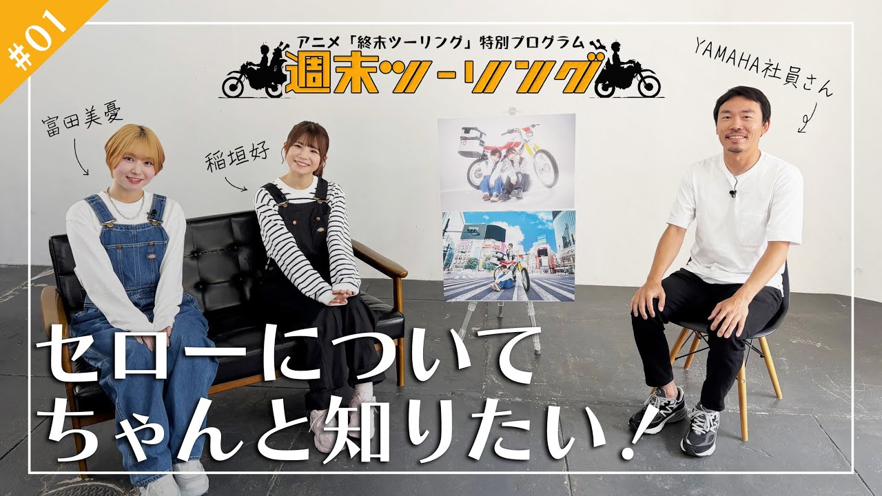 皆さん、こんにちは。アニメ週末ツーリングアり役のとゆです。 はい、よくの稲田小みです。 はい、アニメ週末ツーリングですが、以前生配信でも告知させていただいた通り、 2025年10月から放送開始ですよ。 やった。 ここでこの企画はアニメ放送開始を楽しみに待ってくれている皆さんとツーリングにまつわる様々な企画を通して学んだり、ま、楽しんだり、放送開始までの間私たちと一緒に週末を少しでもワクワクするものにしようという企画になっております。 はい。大して週末ツーリングでございます。字がね、週末の時はウィークエンドの方 [拍手] 週末の方です。 そうです。 はい。 5月にあのガチの 企画会議をしましたね。あのアニプレックスさんの社員戦も背中も映る [音楽] 面白生配信 まれているね。背中がはい。後頭部が映りましたけど したんですけど結構こう反響も大きく ね 盛り上がったようで すごいコメント欄も早かったね。 早かったし、なんか皆さん的にもこれやってほしいとかここ行ってほしいみたいなものもあって、ちょっと色々ね、我々実現できたらなどなど思っております。 [音楽] 視聴者の皆さん、そして宣伝スタッフの皆さんと色々会議しまして、いくつかの企画がなんと決定いたしましたということで、 そして今日はその第1 回になりますので、このみちゃん発表お願いします。 今日の企画は旅の相棒セレオについてちゃんと知りたい。 いい。 うん。うん。 初回って感じ。 初回だね。まずは知ってからね。 まずはね、相棒のこと知らないといけませんから。 そうだよね。でも、ま、ここにもあるけど、私たち写真はね、一緒に撮ったんですよ。 そう。先生がね、組んでくださった。 そう、そう。で、そこであのちょっとね、軽くバイク触ってみたけども うん。 何が何っていう。うん。 そう。まだね、彼女のことはあまりちょっと我々知らないということ。 ないので はい、まずは知っていこうということで、ま、アイリ里と洋子が乗っているバイク、そちらがさっきもね、名前が出た通りセローという、こちらは山さんが製造したオフロードバイクです。 うん。 原作の斎藤先生が週末ツーリングを漫画に描いたきっかけになったのがセロということで、なんと先生過去に [音楽] 日本一周したらしい。 うん。え、 でも確かになんか うん。 アフレコの時もさ、なんかさっきまでなんか栃木行ってましたみたいな言ってた時もそうそうそういい しかもなんかこう1 回行って戻ってきてあげ買い忘れたって言ってそうしてきた アフレコに来たら来てくださってみたいな ね そうそう ということで先生からコメントを頂いていますツーリングで 2 人が乗るバイクにセロを選んだ理由はうん気になる 昔自分がセロ 225 に乗っていて好きだったからと道なき道を行けるバイクなので週末世界を走るならセロだなと思ったからです。 うーん。 株ともちょっと悩んだけど 2 人のだと荷物が冷たくなるので株はやめました。 うん。 へえ。 225っていうのもあるんだね。 うん。うん。 うん。うん。 セロの中にも種類がある。 あるんでこ。 [笑い] そのセロについて私たちキャスト人ももっと深く知ることでアイりと洋子の気持ちを体験するということですね。 うん。うん。ということで本日は、え、セロを詳しく知っていて色々と教えてくれる方に来た、来ていただいております。 おお、 どうぞ。 ああ、ようこそ。 ようこそ。 山ハの前谷です。今日はよろしくお願いします。 よろしくお願いします。 なんとセロの開発の社員さんに来ていただきました。う わあ、これはもうバイクに詳しいどころじゃない。 プロだから プロだから 見に来ていただいております。 はい。 じゃ、ということで、前谷さん、まずセロの歴史についてちょっと是非我々にちょ歩的なことになるんですけど教えていただければと思います。 はい。で、セロはですね、えっと、 1985 年に、えっと、発売されたモデルでして、で、それからですね、約 30 年以上にわって、えっと、日本でロングセラーになっているモデルです。で、ま、いろんなお客さんに乗っていただいて、え、先ほどの 225 という話もあったんですけど、徐々にあの、廃気量を上げたりですとか、あの、進化しながらいろんなお客様に愛されていったというモデルになります。 へえ。我々より年上って思った。ですね、 [音楽] 私同級生実は同じ ああ、セロと同期 同期です。 セローと同期で大学生の時なんかは私もセロ持っていてで はい。 あの斎藤先生と一緒であのツーリングでとことこ走たりもしてました。 ええ、やっぱツーリングに適していたりするっていう感じですかね。 [音楽] そうなんですよね。 で、元々セローはあのオフロードバイクっていう山の中を走るためのものとして生まれているんですけど、えっと、その特に山の中でもあの転んだりしても置きやすかったりですとか、あの、止まってもまたスタートしやすいようにそのシートの高さ
