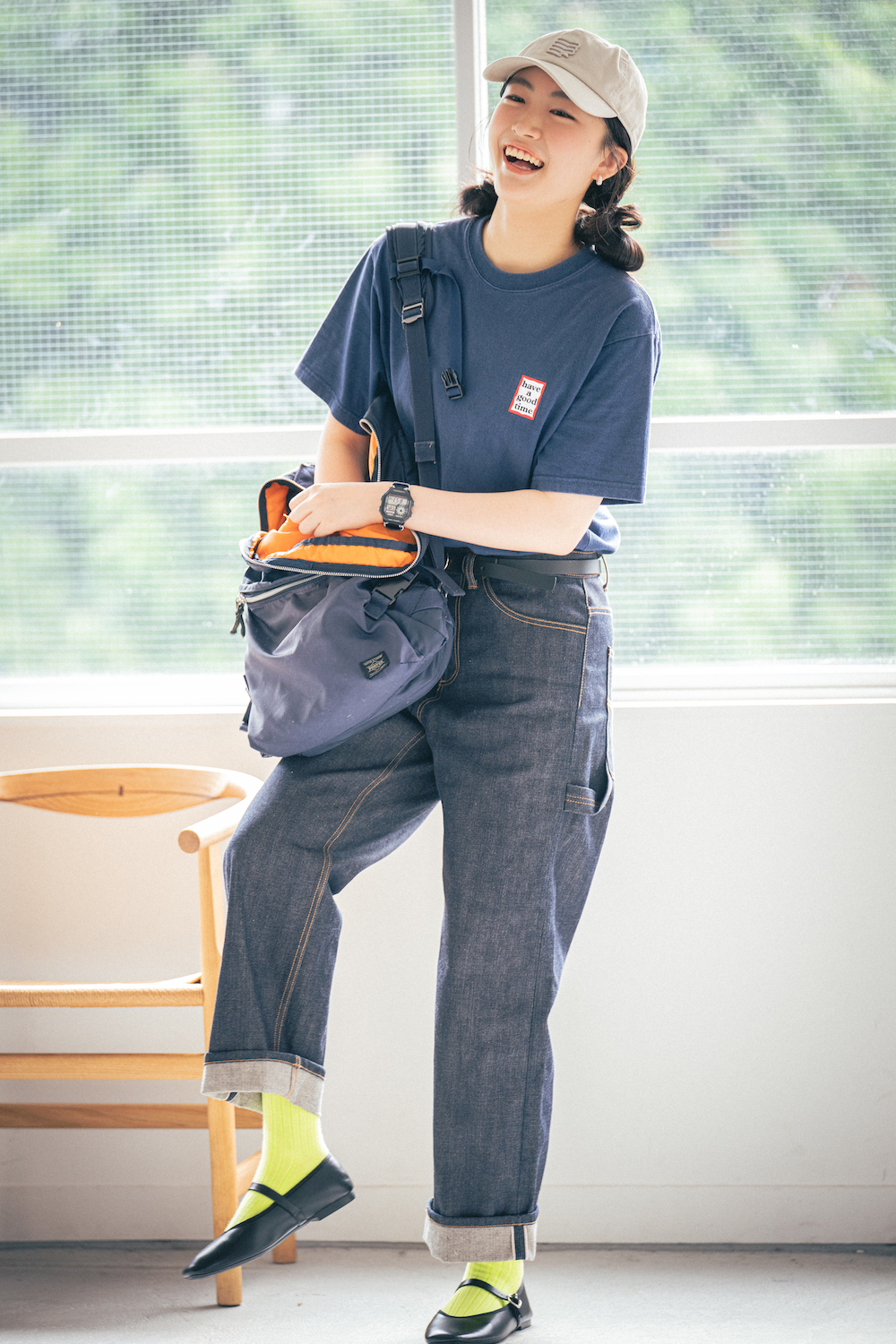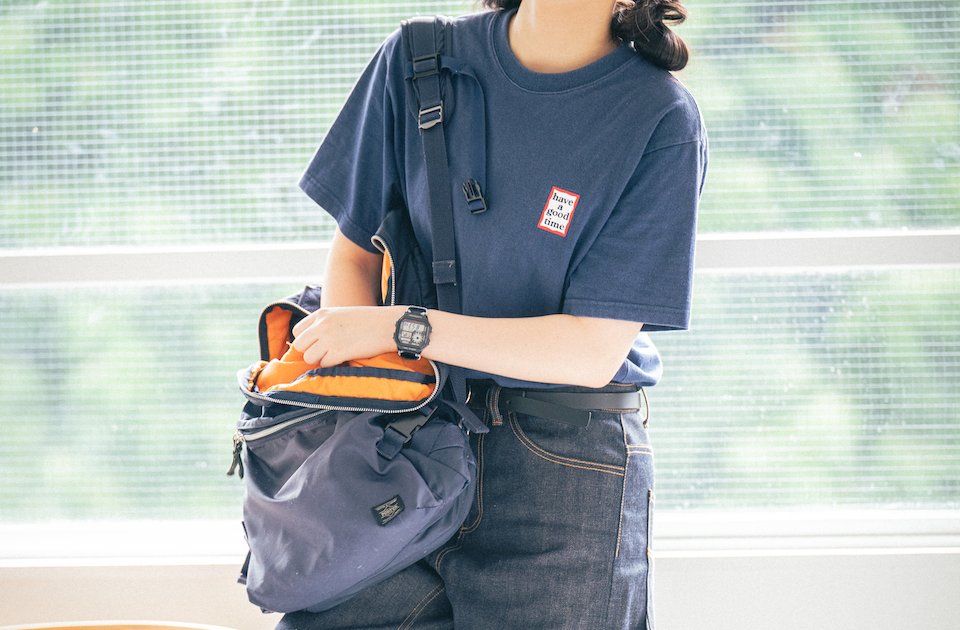本人私物(Tシャツ/have a good time、パンツ/PAR ICI、シューズ/GU、帽子/BROCHURE(USED)、リュック/PORTER(USED)、時計/CASIO(USED)、ピアス/3COINS)