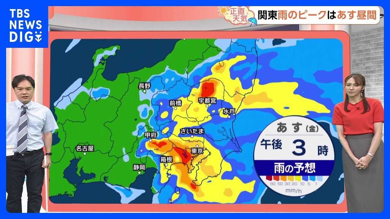 はい、お天気お伝えしていきます。プーナちゃんは 100 円ぐるメを見てお腹が空いちゃったようです。 もうこの時間見るとね、お腹空きますよね。 本当ですね。 はい。 さあ、そして今日関東は雨が降って気温がだいぶ下がりましたね。 そうですね。これ東京は30°下回ったんですね。これ30°下回の 24日ぶりみたいですよ。 はい。そんな だいぶ久しぶりですね。今日エアコンつけなかった方ももしかしたらっしゃったかも。 確かにそれぐらい過ごせますね。 はい。さあ、一方で渋谷の様子見ると、 あ、傘さしてる方いらっしゃいますね。 そうですね。半々ぐらいですかね。ま、振り方弱いそうですけども、この後明日の夕方にかけて関東とこでは 200mmの雨。ま、1 月分くらい相当のはい。雨の降るところもありますので、雨の降り方、十分な警戒が必要なんです。 はい。 で、雨のピークなんですが、こちら明日の昼間、 昼間 がピークになりそうですね。ま、あの、激しく降ると思います。 はい。 さあ、そのままずは気になのはその雨のね、え、もたらすゲの台風 15 号新路ズです。まだ関東からは遠いですね。宮崎県あたりに中心があると見られます。 で、この後東に進んでいくんですね。 で、ま、この台風が近づくとと共に雨雲も活発の甘雲も近づいてくるということなので、ま、明日のこれ新路ズだけ見ると、 ま、明日の夜ぐらいに1 番関と近づくかなと見られるんですが、ま、あまり中心位置にはこだわらずにですね、雨の降り方に警戒していただきたいと思います。で、雨の予想ですね、え、これ午後すいません、 7 時からはい。ですね、時間を動かしていきます。 で、ま、今夜 1杯は雨の中心は西日本で戦場交水隊が発生するような恐れもあります。で、午前 6 時ぐらいからですね、関東によって見ていくと はい。 もうあの西から活発の雨雲が近づいていまして、お昼前ぐらいにはですね、もうここの関東南部、ま、神奈川県などでは黄色い表示になります。 ま、黄色い表示のところですと、もう傘を差していても塗れるようなそんな雨の降り方をしそうですね。 かなりとしゃぶりですね。 そうですね。そして小午になると、え、栃木県ですとか北部などでも活発の雨雲がかかります。 で、やっぱりお昼前後がですね、ピークですから午後 3 時の時点で、ま、ちょっとオレンジとかね、赤の表示も一部で見られるということで、もうちょっと外で歩くのも難しいぐらいの振り方をするかもしれませんね。 不要不及の外出は控えた方が良さそうですね。 そうですね。なるべくお家にいた方が明日はいいのかなと思います。 で、午後7 時ぐらいにはかなりんできそうですが、ま、若干これまだ明日の予報ですけれども、ブレはあると思いますので、ま、こういうピークもですね、ま、ちょっとずれがあると思って、幅を持ってですね、え、明日は余裕を持った行動を心がけていただきたいと思います。 はい。では明日の予報を見ていきましょう。 ということで明日は、ま、1 日ぶりということになりそうです。はい。 ま、あの、風は、ま、沿岸部を除いてはあまり強くはないと思うんですが、ま、振り方が強いということになります。 はい。 北部、埼玉も同様ですね。朝には雨が降っていそうです。ま、あの、予想通りであれば、ま、 6時以降、ま、止んでくるとは思います。 お、帰りの時間帯はもしかしたら んでるかもしれないですね。 最低気温は今朝と同じか。ま、低いところもあって、北部では 25°未満、熱帯屋にはならないところも多いでしょう。うん。 で、日の気温は今日都と同じかちょっと高いとこもあって、ま、東京は30°マ 7 マナつびになるかならないかぐらいのギリギリのところだと思います。うん。さあ、この先の予報です。 [音楽] はい。もう土曜日にはすっかり天気は回復して晴れるんですが、こうなるとまた暑くなりますね。 月曜日また36°も予想されてます。 はい。