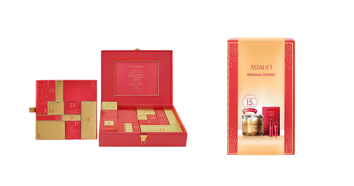富士フイルムのエイジングケアブランド「アスタリフト(ASTALIFT)」は10月31日、スキンケアとヘアケアアイテム全25種が入った“アドベントカレンダー2025”(5万3000円)と、スキンケアアイテム3種に加えスペシャルケアのシートマスクがセットになった“ホワイトジェリー15周年プレミアムコフレ”(1万4300円)を発売する。また、10月15〜21日にアットコスメ オーサカ(@COSME OSAKA)で、ポップアップイベントを開催する。