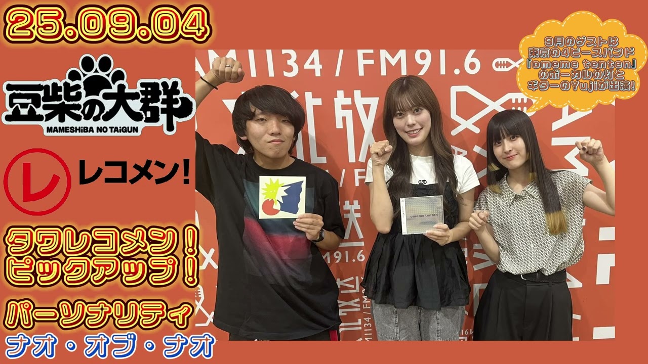 [音楽] こんばんは。全国のタワーレコード スタッフが己れの耳と直感だけ信じて選ん だまだ世間で話題になる前のアーティスト をいち早くピックアップするタワレコメン とZ世代の好きにもっと寄り添い月を 広げるレコメレコメンが月に1度コラボ するコーナー。その名もタれコメ ピックアップ。パーソナリティは豆芝の 大軍のオブナおです。はい。私直オブナは ですね、最近なんかお仕事でなぜかこう 大喜りをすることが多くなりましてですね 。最近で言うと黒フェスっていうあの豆し の大軍のプロデューサーのくロちゃんが 主催するフェスがアイドルフェスがあるん ですが、それの記者会見にこうゲストで プロちゃんが呼んでくれてあの出演したん ですがそこでなぜか大喜りをみんなでや るっていうあの状況に出くわしましてでも なんかすごいくロちゃんが褒めてくれて なんか成長したねって笑いに変える力を 持ってて関心したしっていうLINが届い て嬉しかったです。あの、そんな クロフェス20256年目クロフェスと 結婚するシというタイトルで今年も クロフェス開催されるんですが、9月 131415 の3日間開催されまして、豆しの大軍は9 月13日と15日の2日出演させて いただきますので、海の森水競技場にて 行われます。是非皆さん遊びに来て ください。ということでこの後すぐ今月の タワルコメピックアップアーティストが 登場です。 [音楽] タれコメンピックアップ。 それでは今月のタわれコメンアーティスト をご紹介します。ロックバンドおめてから こちらのメンバーをお招きしました。自己 紹介します。はい。 え、お目め点のギターボーカルあかりです。 ギターの裕二です。 よろしくお願いします。 よろしくお願いします。 あの 噂によるとですね、あのあかりさんが はい。 豆しの大軍がお好きということ。豆粒でもう本当にいや、今日本当にドキドキしてて、 私さっき見ましたよね。 私結構初めてバンド初めて結構ラジオとか出演させていただいてるんですけど、あんなに手が震えた 初めてでも さっきね、ご挨拶させていただいた時に もうすごいなんか鍋粒ぶですって言ってくださってなんかその YouTube も見てますって言って言ってくれた内容がめっちゃ初期のだったりとか最近のものまで てくださったりとかからこのラジオが決まる前からやっぱりもう普通にもう家のソファーとかでめっちゃ見てて ええ もうだからライ映像も本当にSNS でももうずっと見てたので ええ、嬉しい。 嬉しくて嬉しくてなおさんからおめめてんてんという言葉が発せられたのが嬉しいです。 嬉しい。 ありがとうございます。豆粒ぶのみんな聞いてる?これ聞いてください。 本当にめちゃくちゃ嬉しいことが起きてます。それではおめめてのあかりさんと裕二さんにお話を伺っていきましょう。 [音楽] はい。お願いします。おめては2022年 4 月東京にて結成された女性ボーカルのロックバンドです。 ちなみにありさんと裕二さんが初めて会った時お互いの第 [音楽] 1印象ってどう思ってました? 私は明確にあって 私初めて会った時にもう髪がええげなぐらい長かった。 え、この人なんかなんだろう?キノコみたいなもうすっごい怖い髪型だったんです。 髪のドストレートのもう目まで隠れてるキノコ。 本当にな、なんでですか? いや、なんかもう切るタイミングを失って その時多分眉毛もなくて あ、え、やばかったんです。怖かった。 ってる。 そうでなんかタバコも吸うから喫煙所とかにいる なんか怖い怖い ガリガリの怖い なんか怖いギタリストみたいな。今すごいじゃあ丸くなられて そうなんです。もうあのおめめてんてんだっておめ目めてんてんってバンド目でねその見た目下がりすぎじゃないですか。 確かにちゃんとやっぱキャラにしとってもらって。 うん。え、裕二さんはあかりさんの私の第 1印象。 あ、そう。 明りと初めて会ったのはあんま覚えてないんですけど、 [音楽] なんか最初に喋った時に はい。 しょっぱなため口でこいつやるなと思って。 え、覚えてない。 同年だったん?同い年ですか? あ、年齢は1個上なんで。 あの、当時大学サークルで出会って一応その彼は 1個上だけど同期浪してて なるほどなるほど。 で、それで、ま、浪人認してるけど、ま、別に同期だよねみたいな普通に感じでなんか普通にバチってきて やるなと思ってなんかその怖い見た目であの打ち解けずにいたんで彼は。 うん。うん。 あ、じゃ、その壁をこう結っ払って哀れみの 哀れ身のため口だった。 怖い見た目だったよね。髪が長くて今やこんなに。 あ、あれはひどいっす。やばい。 やばいよね。ま、そんな大事印象者でした。 そうです。あの、ちなみになんですけど、ま、さっきから出てそのおめ目めてんてんていうバンド目うん。 その由来っていうのは何かあるんですか? もうこれももう全てがのリで決まっちゃってるんですけど、これももうお目め点。私はなんか目が点々としたキャラクターがすごく好きなんです