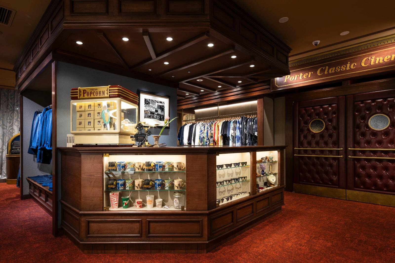 気になる店内は、映画『キル・ビル』や『国宝』を手がけた美術監督・種田陽平と東宝映像美術チームが製作を担当。映写機、チケットブース、シアタールーム、アクトレスミラーといった映画・映画館の設備がずらりと並ぶほか、ポータークラシックが愛する名作映画のポスターも展示されている。