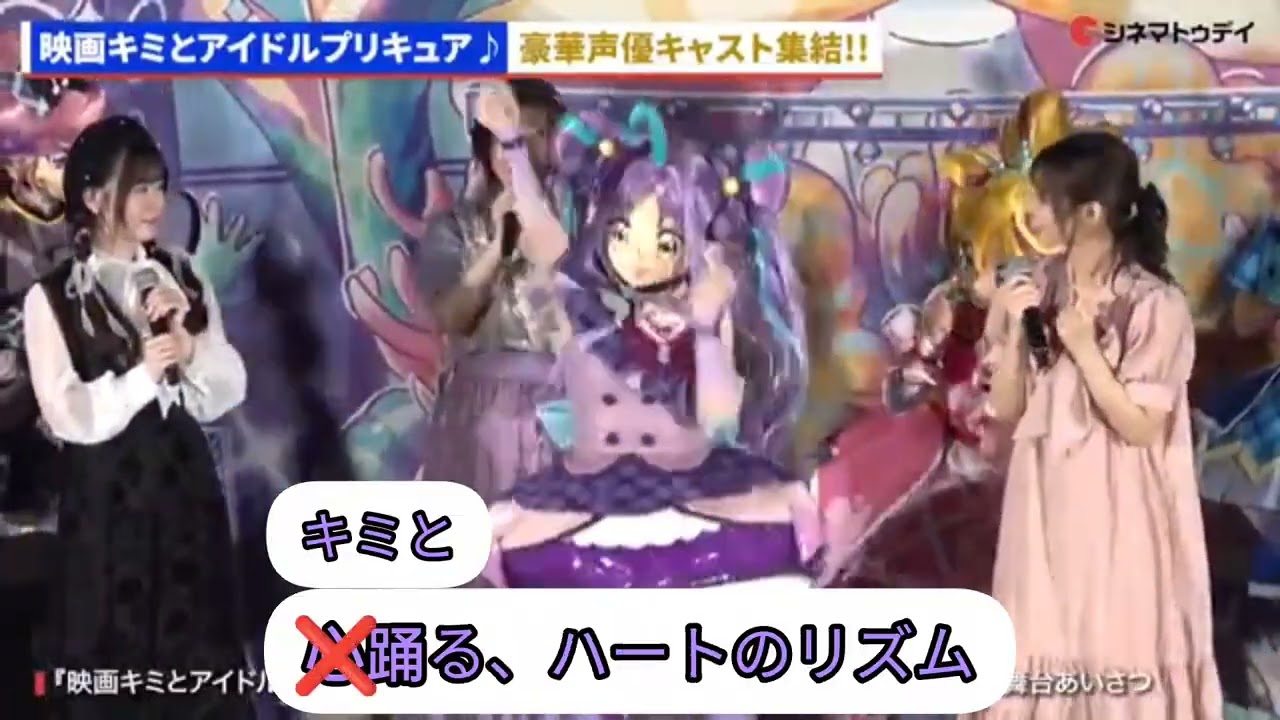 本日9月13日に行われた、キミとアイドルプリキュア♪の映画の舞台挨拶の午前の回の切り抜きです。キュアキュンキュン役の高森奈津美さんも生名乗りをしていましたが、若干セリフを間違えてしまっています。観客や他のキャストさんは気づいていなかったようですが、本人が後で間違いに気づいたようで、午後は間違えないようにカンペを用意してセリフを読んでいました。