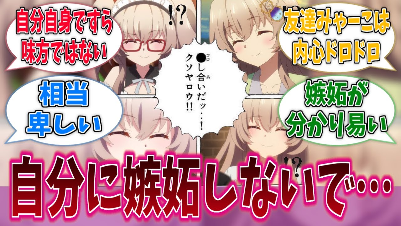 今回は自分に嫉妬しないでに対する反応集を紹介します。自分で殺し合うな。多分雪色にゃこ先輩が最弱。 [音楽] 自分身ですら味方ではないのか。 やっぱり右上が1番強そうに見える。 ゲームでも別の枝の自分に嫉妬してたからな。友達子はだいぶ内心ドロドロしてそう。 雪色はカジイベント取られたのはだいぶ不利だよな。 なんかアニメ見る限り火事なくても落ちてそう。 カジの剣で一気に恋まで振り切っただけでその前から好感度は高いからね。 ずっと前から男としてありよりだなってところありになったのが本編だもんな。 惚れたのはにゃあこ先輩の方が先だもんな。だからいきなり湧いて出てきて速攻でにみ君に色目使ってくるデカパイのことは嫌い。 あの、もっと先に惚れてる人が 妹はよほどのことがない限りは盗撮我慢してるから。悲しいことに妹は自分で書いたラブレターを自分で破り捨てて盗撮しかできない。 妹はニヤンの方がハンバーグでかいとか言ってアシストするからな。 あ、にゃあこ先輩嫉妬してるな。そして本人自身気がついてないな。 こいつはにゃこA。あ、木声がでかいぞ。 こいつはにゃこB。 あ木声がでかいぞ。こいつはにゃこ C。あ木声がでかいぞ。こいつはにゃこ D。あ木声がでかいぞ。 り人頼む。静かに。 かける君の子供は私が産みますので。 全員で産めばいいじゃん。 戦が始まる。 にゃーこ先輩相当癒しいよ。 にゃーこ先輩の嫉妬分かりやすいから他の人すぐ気づくよ。 嫉妬してる本人は気がついていない。 めちゃくちゃ穏やかそうに見えて切れると煽り合いとかもする人。 にゃーこ先輩の嫉妬ぶ深さはもっとクローズアップしろ。原作だとカジのイベントを奪われてたからこの枝のにゃあこ先輩ってニアンに惚れてんのかな? って気になってたけどアニメは亀子から助けに行った時点でがっつり惚れててダメだった。原作でも助けた時ほ染めてた。 にゃこA に惚れたままパフェクイーン落とすのはひどくない? あそこまでプロいとは思わなくて パフェクイーンの気を引くやり方で近づきたがあれで落ちるなんて普通は思わないぞ。 にゃあこ先輩結構ぐチぐチ言うよね。 [拍手] 全てを受け入れます。 最終決戦時他の枝で高坂先輩にゆきさんにそれにそらちゃんまでぐチぐチ 普段が大きくて優しいからぐチぐチゆうにゃこ先輩が可愛いんだろうが 友達なのになんで独然よく強いんですか? お友達が彼女らしちゃ悪いってのか? アニメのにゃーこ先輩って今何人目? 4 人目。 にゃーこA は彼女になって石になった。にゃーこ Bはお水どスどスしてたら石になった。 [音楽] にゃーこC はいつか定されるだろうけど元気です。ニャーコ Dはプラーナを濁してくる。 こんだけ嫉妬深いと新にゃあこ先輩の内心マジですごいことになってそう。 新のにゃあこ先輩はおじいちゃんとおばあちゃんになっても他の枝で他の女と結ばれる可能性があることをぐチぐチ言ってそう。 恋人にゃーこはニやんに記憶がないから 1 年ぐらい馴じったら止めると思う。友達にゃこはニやんに記憶があるから一生言う。 恋人の記憶を持ったお友達だから色々複雑なんだよ。 お友達だけど他の女と仲良くしてたらぶち切れるよ。にゃこ先輩はお友達が恋人と同技でないことを分かっておられるのか? いざとなければ記憶見て浮気チェックできるのがずるいだろ。 自分に嫉妬しないでに対する反応集いかがでしたでしょうか?ご視聴ありがとうございました。高評価、チャンネル登録お願いいたします。 それでは次の動画でお会いしましょう。