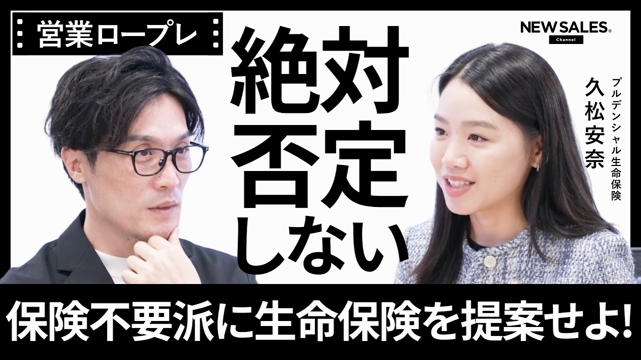 せっかく保険の話ってなかなかつまらないし、あんまりこう興味を持てないからこそ、今しか集中するタイミングないかもとかって言って はい。 パソコンを閉じていただいて。 [音楽] トップセールスは難しい営業シーンをどのようにしてクリアしていくのかを再現していただくロールプレイ企画セールスロールプレイをお送りさせていただきます。本日もトップセールスの方がリアルにどのような相談をしているのか本質的な中身を皆さんにお届けしたいと思っております。それでは本日ロープレにチャレンジしていただきますのはプレルデンシャル生命保険営業所長トップセールスの久松あさんです。久松さんよろしくお願いいたします。 お願いします。 お願いします。 どうぞみください。本日はお越しいただきましてありがとうございます。 はい、よろしくお願いします。 改めて久松さんのご経歴をご紹介させていただきます。 2015 年会社オプトに新卒入社コンサルタントとしてキャリアをスタート。その後 2019 年に営業未経験でプルデンシャル生命保険職され入社以来社長杯を 6年連続で入勝。 MDRTCOTも6 年連続で達成されています。 久松さんの素晴らしいご経歴拝見させていただく中でプルデンシャル生命保険の営業ロープレの動画が歴代最多視聴されていらっしゃるっていうことなんですよね。 はい。ありがとうございます。 すごいですね。これはもう今までそのたくさんの動画の中で 1番見られてるっていうこと。 そうですね。ありがたいことに ああ自信はものすごくありそうですね。 120%ぐらい 100 超えてましたね。 素晴らしい。 ではもう早速ロープレに移らさせていただきたいと思います。今回のロープレテーマこちらになります。 はい。はい。 保険不要派に生命保険を売れです。 はい。 いかがでしょうか?難しいテーマ設定になってると思うんですが はい。 印象どうですか? 難しくないです。 あ、難しくないんですね。 はい。あの、お客様最初保険入れなくて来てる方じゃないんで うん。 いらないとか興味ないって方に対して今までこう担当させてもらっていたっていう経験ではあるのであのつものようにお話しさせてもらえた 思っております。 分かりました。結構こう保険不要っていうお話は割とこう巷田でも色々な情報が出ていると思いますのでその難しい中でも是非こうどんな営業を繰り広げられるのか是非とも披露していただきたいと思っております。 はい。 ロープレの設定お伝えさせていただきます。 はい。 登場人物は保険不要派の 40 代男性を私が演じます。で、背景は既婚でお子様が 2人いらっしゃるという設定です。 で、住宅ンはあるんですが、団体信用生命保険に加入されていて、今住宅論は 10年ぐらい返済みの状態です。 で、保険はコスパが悪いというイメージがあったり、保険不要だというようなネットの情報に結構こう引っ張られたりとしているような方だと思っていただければと思います。 はい。 はい。で、今回のアポイントの設定は共通の知人からのご紹介で初回のお話を聞くというお時間を頂いているという設定でやらせてください。 はい。はい。 で、ゴールに関しては前向きな合意をだく、返答をいただくか、ま、もしくは時間オーバーになってしまうかで、え、ロープレイを終了とさせていただきたいと思っております。 はい。はい。 で、ここであのゲストの皆さんには内緒なんですが、無茶ぶりルールというものを設定させていただいております。今こちらに表示されているんですが、是非視聴者の皆さんはですね、この無茶ぶりも含めて、あの、楽しみながらどのように返していくのか見ていただければと思います。 ささん、無茶ぶりルール見えますか? いや、何もないですね、本当に。 はい。本当に何もない。あの、スタジオ上全く見えてい そうですね。はい。 はい。あの、この無茶ぶりルールは、あの、我々の方で急に入れさせていただいてますので、 是非答えをいただきたいと思います。 はい。 では早速ですがロープレをスタートさせていただきたいと思います。 はい、 鈴木さん、初めまして。 はい、初めまして。 プロデンシャル生命保険の久那申します。 よろしくお願いします。 はい、よろしくお願いします。 今日田中さんからはどんな風にお話聞いていらっしゃいますか? ま、あの、すごくエネルギーがある、あの、保険の営業の方がいらっしゃるんで、 1 回あってみないかとは言われたんですけど。 あ、そうだったんですね。 保険ご興味終わりですか? うーん。まあ、ちょっと、ま、あるかないかで言うともしかしたらそこまで強く持ってないかもしれないですね。 そうだったんですね。うん。 その中今日お越しいただいたのって何か理由ってあったりされますか? まあ家族はいるので、ま、何かしらあの起きた時にはっていう気持ちは心の中にあるかないかで言うと、ま、あるので お素晴らしいですね。そん中でもわざわざ来た理由って