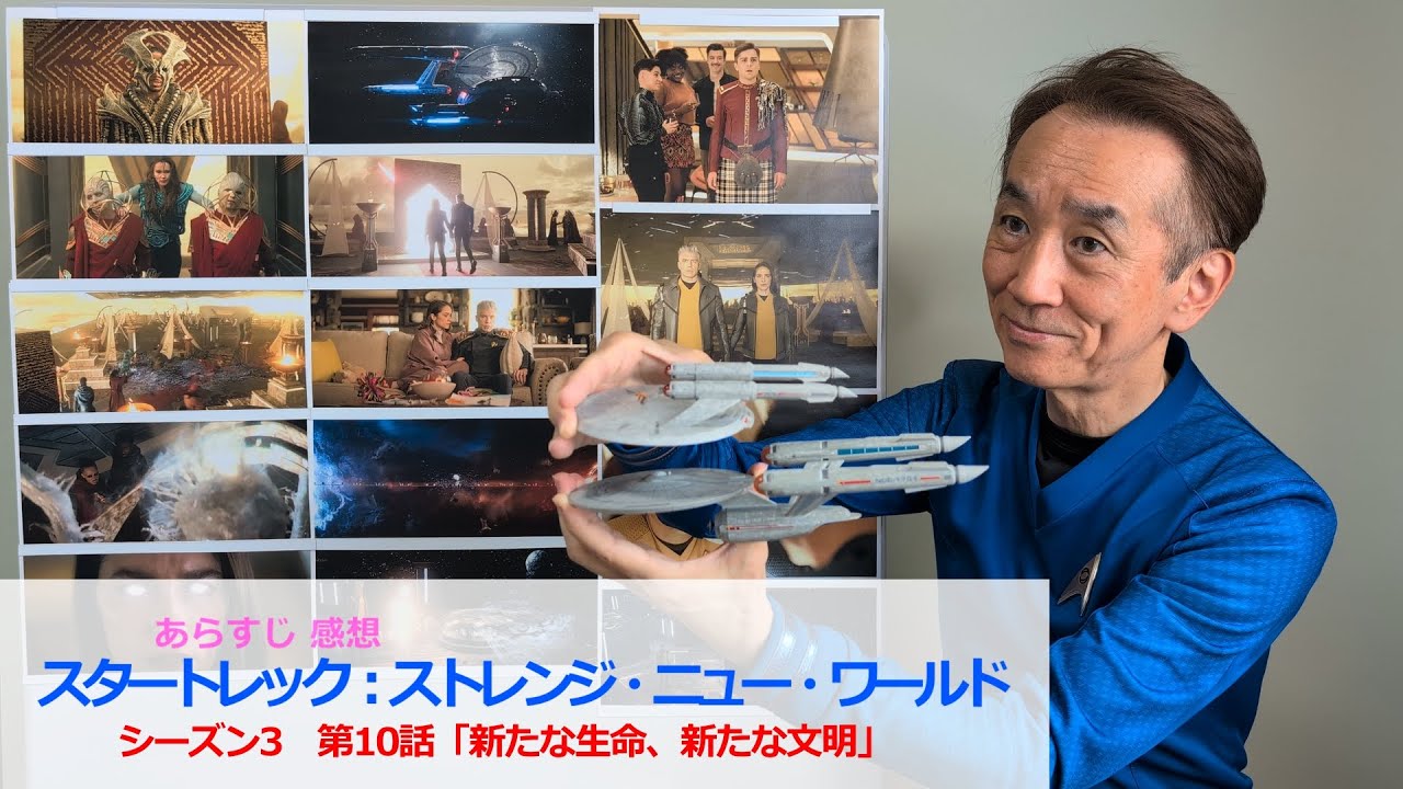 皆さん、こんにちは。トレックボーイです 。スターレックストレンジニューワールド シーズン3第10話新たな生命、新たな 文明のあすじや感想を語っていきます。 まだご覧になっていない方はパラマウント プラスで先にご覧ください。2025年9 月11日に公開されたエピソードです。 いいでしょうか? では始めます。 シーズン3の最終回です。え、エピソード の後半は色々な解釈があるかもしれません ね。あらすを見ていきましょう。バテルが 艦隊の司法部長に就任することが決まり、 パイクはサプライズパーティーを開きます 。約束の清掃ドッキリにスコッティが 引っかかって笑えますね。え、ペリアが 昔々昔私がタイムトラベルするドクターと 言いそうになって慌てていえ旅するお医者 さんと知り合った時のことと言い換えます がこれってドクターフーのことですよね。 え、以前のエピソードでペリアの部屋に イギリスの赤い電話ボックスが置いてあっ たので、なんであんな邪魔なものが部屋に 置いてあるのだろうと不思議に思ったの ですが、謎が溶けました。この電話 ボックスです。 え、余談はさておき。シャペルによると、 え、神博士は現在惑星スカイ5案の カリカチュナという町に遠征しているよう です。え、カリカチュナとはベズダに 取り憑かれたギャンブルが口にした言葉 です。え、第5話のこのシーン。 おさいになりますが、ベズダとは マクルーン語でジャークという意味です。 あのバディアナインのジーンには無数の ベズダを閉じ込めた韓国があり、それを 見張が守っていました。え、しかし死体の そばにあった球体が割れて中からベズダが 出現。それがギャンブルの体に入って彼は 邪悪な存在になったわけです。 ベズダギャンブルと呼ぶべきかもしれませ んが、ここでは単にギャンブル。と呼ぶ ことにしましょう。話を戻します。 神によればそのカリカチュナという町では ベズダが神として崇められている。え、 ベズダやバディアナインの謎を調べるため にコービーはその町へ行き、そこの生殖者 ゼペレスに会おうとしているわけです。 しかし大変なことが起きていました。 ギャンブルが天バッファーから逃げたの です。ギャンブルの肉体を再構築して惑星 スカイアへ向かったと見られます。 エンタープライズはすぐに後を追います。 不安は適中。スカイゴ案ではギャンブルが 生殖者ゼペレスになって人々に呪文を唱え ています。 え、 これが 生殖者ゼペレスになったギャンブルですね 。 え、人々が忽然として自分の目を潰すのが グロテスクですね。 そこにエンタープライズのクルーが到着。 え、この時にラーンがバルカン神経掴みで 門番を気絶させるのが面白いですね。え、 ラーはスポックにダンスを教える傍原 バルカンの技を習っているようですね。え 、チャペルが習ったけど無理だった。親指 どうやるのと聞くのが笑えます。 え、クルーは神尾博士と合流しました。え 、すると奇妙なことに、扉の壁にはスワヒ で無ガのことが書かれていました。え、 まるで無ガがここに来ることが運命付け られているかのようです。え、するとそれ を待っていたかのようにギャンブルは無ガ を道連れにして、え、扉の中に消えました 。 え、このエネルギーを手から発射するよう な攻撃がベズダの特徴ですが、え、潜在 写真にもそのシーンがありました。 えー、特殊効果を加えた潜在写真は珍しい です。で、え、その扉は、あ、バディアナ 9の韓国へ通じていました。それは無ベガ とギャンブルの2人一緒でしか通れない ように作られていたのです。 え、ギャンブルの目的は、え、バディアナ の韓国へ戻り仲間を解き放つこと。つまり 見張版の破壊です。 え、ギャンブルは像に、え、見張版の像に 一撃を加えました。 え、するとエンタープライズの線内で バテルの目が異様に光ります。 そです。見張板の像とバテルはあ、リンク しているのです。というか両者の生命 サインは同じです。 バテルの肉体は、え、ゴーンのDNAや イリリア人の血や、え、キメラブロッサム によって見張り板に変わりつつあるのかも しれませんね。 え、今度はバテルとパイクが惑星スカイゴ 案へ向かいます。 えー、さて、ここまでで皆さんもすでにお 気づきでしょう。え、今回のエピソードに は運命論的な筋書きが見られます。運命論 とは出来事があかじめそうなるように定め られている。それを変えることはできない という考え方です。 え、エピソードでは副総次元空間では因果 関係が逆転することがあるという説明をし ていますが、え、運命論と似ているように 感じませんか?え、つまり結果が先に 決まっていて、え、それに合わせないと先 に進めないという設定です。 ん、例えば無ガとギャンブルはここに来る 運命だった。だからその2人でしか通れ ないように扉は作られている。 え、バテルは見張となる運命だった。だ から様々な種族のベズとの戦いを遺伝子 レベルで吸収し、え、守護