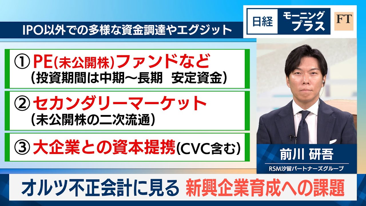 ここからは特集です。今日のテーマこちら です。オルツ不正会計に見る進興育成への 課題です。ゲストはRSM塩止め パートナーズグループの前川け吾さんです 。前川さんは公認会計士として長年上場 企業を中心とした監査業務やIPO新規 上場支援業務に携わってきました。 現在は国内外の経営コンサルティングや M&Aに 関する助言なども掛けていらっしゃいます。よろしくお願いいたします。 よろしくお願いします。 え、今回は先月末に東初グロース市場を上場廃止となったオルツの問題から日本の進興の課題について考えます。まずは一連の不正会計問題について佐藤さんからです。はい。 去年10月に当初グロースに上場した オルツはAIの開発を手掛ける企業です。 不正会計が発覚したのは今年4月でした。 7月下旬に公表された調査報告書では上場 前の2021年から主力のAI技疑似力で 不正な売上の水増しがあったこと。上場に 至るまでに監査法人の他証券会社や ベンチャーキャピタルに事実と異なる説明 をしていたことが発覚しました。取引最終 日となった先月29日は1株5円で取引が 終了。上場からわずか10ヶ月余りで株式 市場から退上しました。時価総額は上場時 の1/100に減っています。 大きな衝撃を与えたこの 1 連の不正会見問題ですけれども、調査報告書を読んでま香さんどんな印象を持ったでしょうか? はい。 売上の大半が実態を伴わない取引いわゆる循環取引だったこと うん。 そして刑人のプレッシャーや内部統制の不備が背景にあったことが明らかになりました。 さらにガバナンスが軽外化し、社外取り締まり役による監督や監査役監査、内部監査などによるチェック機能が十分に働かなかった点が最大の問題だという印象です。 うん。あの、上場準備段階の 2022 年に監査法人の交代というのがありましたよね。その監査法人の責任についてはどのように見たらいいでしょうか? はい。 はい。 え、監査法人の監査がどのように行われるかについては一般の投資家には分かりづらいものであると考えています。 監査法人には強制捜査権などがあるわけではないので 監査には限界があると言えます。 え、大手監査法人の案件としては、ま、儲かりづらい、え、規模の小さい進興の監査は、ま、あまりやりたがらないという傾向があるかと思います。一方で IPO 監査について中監査法人だからダめというのもまた違うかなと個人的には考えております。 今回大手監査法人が合理的な意見形成ができず、え、監査を継続することができなかった。え、そのため中小監査法人へ監査人が交代したことは、 ま、確かに監査法人を変えることによって適正だという意見を手に入れたようにも見えかねないなと考えています。 [音楽] え、報告書を読む限り、え、監査法人の交代後に大きく循環取引が膨らんだと理解しています。 あの、金融庁のデータを見ますとね、え、 会計士の登録者数というのは増えています 。にも関わらず監査法人に所属する人は 横倍という状況が続いてます。あの、 人手不足というのも影響してるんでしょう か?はい。え、監査法人業界全体で、え、 人材不足が深刻だという風に聞いています 。え、特にコンサルティング企業や 事業会社へ流出しております。え、その ため関査法人では多様な人材の採用も重要 なのですが、え、AIによる取引データの 分析強化が不可欠だなと考えています。え 、それによって効率的な進めつつ、疑い ポイントについてフラグが上がるような 仕組みも大切かなと思います。え、加えて 、え、過去の不正事例について、え、研修 など学びの機会を増やすことも重要だと 思います。うん。 あの、その過去には反動体製造装置メーカーの FOI が色決済に関して主漢事証券会社の水保証券が責任を問われた例というのもありました。あの今回主観事だった大話証券、それから上場を承認した当初の責任についてはどのように見たらいいでしょう? はい。え、当初は実質的な審査機能を持つことが難しいため、やはり主管事証券会社が鍵になるかなと思います。 財務表の適正性に関しては一定の責任は 監査法人にはあるものの、主管事証券会社 には、ま、ビジネスをよく理解して、え、 震度のある審査を行い、上場前に見抜いて 欲しかったなと思います。最近の監査法人 の監査には、ま、必要な監査手続きの遂行 に追われるという側面もあって、木を見て 森を見ずという状況になりがちであり、ま 、関査にはまたもあります。え、3 つの証券市場の万人、え、すなわち証券取引場 はい。