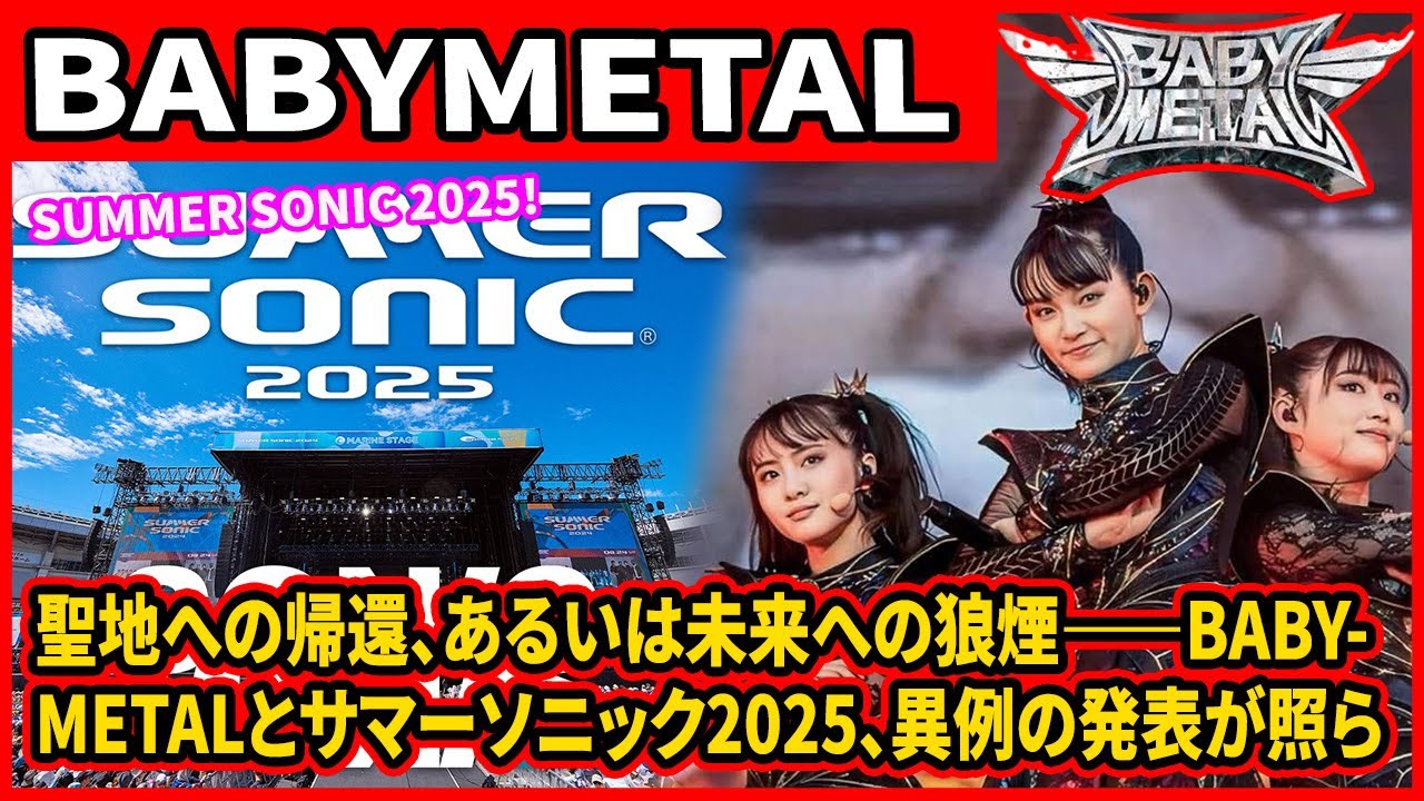 音楽業界に静かでありながら近く変動を 予感させるほどの確かな衝撃が走りました 。は、まるで未来から届けられた予告上の ように我々の前に突然提示されたのです。 その驚くべきリストの中に一気は強く、 そして戦列に輝く名前がありました。 ベビーメタル。この3つの神聖がフォール アウトボーイやアリシアキーズといった 世代やジャンルを超えてリスペクトを 集める世界のトップアーティストたちと肩 を並べいち早くクレジットされたという 事実。これを目にした瞬間多くのファン そして我々のような業界の人間は直感的に 理解したはずです。これは単なる出演 スケジュールの告知ではないと。むしろ これは1つの生命であり、集頭に準備され た壮大な物語の助賞なのです。ベビー メタルのサマーソニック2025への出演 決定は1つのニュースを超えた極めて戦略 的な一手であり、彼女たちが自らの地と汗 で気づき上げてきたフェスティバルの女王 としての地位を改めて世界に示す宝かな 宣言に他なりません。そしてそれは私たち チームベビーメタルが心のどこかでずっと 待ち望んでいた。さらに壮大で予測不可能 な新象の幕明けを告げる運命のしなのです 。だからこそ私たちはこの発表が持つ 多意味を丁寧にそして深く解き明かさ なければなりません。この慰例の事態は 単にベビーメタルがサマーソニックに出演 するという事実以上に彼女たちの現在地、 そしてこれから進むべき未来のコ路を有便 に物語っているからです。その意味を理解 するためにはまず記憶の糸を少しだけ たり寄せ、ベビーメタルとサマーソニック というフェスティバルが紡いできた切って も切れない深い絆の歴史を再放する必要が あります。それは単なる演者と フェスティバルの関係を超えた1つの壮大 な成長物語として語り継がれるべきもの です。その始まりは2012年。当時巨大 な会場の片隅に設けられた最も小さな ステージの1つであったアイドルソニック のテントに彼女たちは初めてその姿を表し ました。まだその存在がごく一部の 早気耳気みなリスナーの間でのみ、何か 面白いことが起きているらしいとさやかれ 、多くの音楽ファンにとっては後期と一の 会議の目で見られていた時代です。 アイドルとヘビーメタルという本来水と油 のように決して交わるはずのない2つの 要素を禁断の方法で融合させた。その音楽 は多くの人々にとってまさに未との遭遇 でした。当時の現場の空気を思い出すと 困惑と興奮が入り混じった何とも言えない ざめきが満ちていたことを記憶しています 。しかし、その小さなステージから放たれ た少女たちの身の竹には到底収まらない 凄まじいエネルギーとバッグを固める紙 バンドの圧倒的な演奏力、そして何より そのコンセプトの完成度はそこに偶然わせ た人々のド肝を抜き、固定観念をこっぱ み人に打ち砕きました。あれこそが後に 世界を巻き込むことになるメタル レジスタンスという壮大な物語のまさに う声となった瞬間だったのです。翌年 彼女たちは早くもレインボーステージへと 駒を進めます。これはわずか1年という 短い期間で彼女たちの存在が口コみや インターネットを通じて爆発的に拡散し、 もはや無視できない規模の熱狂を生み出し ていたことの何よりの証拠でした。そして 運命の2014年が訪れます。帝国の伝説 的なメタルフェス、ソニスフィアにて メタルの本場の数万人の観客を前に奇跡的 なパフォーマンスを繰り広げ、歴史的な 成功を納めた彼女たちはその勢いのまま 凱旋するかのようにサマーソニックの 最大級のステージ、マリンステージへと 一気に駆け上がったのです。これは単なる ステージの規模の拡大ではありません。 日本のアンダーグラウンドから生まれた遺 の存在が世界基準の評価という最強の武器 を手にし、それを故郷の最大の フェスティバルで宝かに証明するという1 つの大きな転換点でした。もはや苦しい アイドルではなく、世界が認めた アーティストとして何万もの観客を前に 堂々とパフォーマンスする彼女たちの姿は 日本の音楽シーンにおける1つの事件とし て多くの人々の記憶に深く刻まれています 。その後も2015年2017年と彼女 たちはサマーソニックの常連としてその ステージに立ち続けました。その頃には もう彼女たちは新人でも挑戦者でもあり ませんでした。世界中をツアーで駆け巡り ウェンブリー、アリーナや東京ドームと いった伝説的な会場を次々と制覇し、数々 の伝説を打ち立てたフェスティバルの ベテランとして風格すら漂わせていました 。サマーソニックは彼女たちにとって世界 での過酷な戦いの成果を日本のファンに 報告し、その成長を共に確かめ合うホーム グラウンドのような温かくも特別な場所に なっていったのです。このようにサマー ソニックというフェスティバルは単なる 出演イベントの1つではなく、ベビー メタルのキャリアにおける成長の記録その ものであり、1つ1つの出演が彼女たちの 