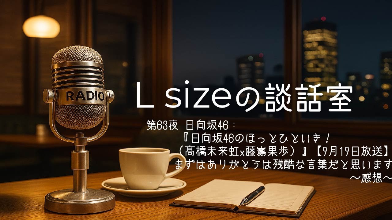 [音楽] こんばんは。Lサイズの弾和室第63やで ございます。え、今回はローソン プレゼンツ日向坂46のホット1息につい て、え、9月19日放送部についてお話を していきたいと思います。で、今回も前回 に引き続き、えー、キャプテンですね、 ミックニンと、えー、カほりんということ でこの2人で、え、お送りをしておりまし た。で、今週も面白かったです。前回に 引き続きというか。はい。めちゃくちゃ 面白いなと思ったんですけれども、 やっぱりあのオーディの方であの ディレクターズカット版を流してるんです けど、ま、それを本編にできないの かしらっていう、ま、尺の都合があってね 、ま、多分出せないんだと思うんですけど 、いや、もったいないなと思って結局、ま 、本編だけでも面白いんですけど、その ディレクターズカットでやっぱこ 気象点結が分かるっていうか、あの間の トークとかも分かるんで、それ結構面白い ので、ま、長めに、ま、ODで聞けるから いいかみたいな話もあるんですけど、ま、 ちょっとそれを思ったという感じでござい ます。で、ま、今回ですね、今いくつか トピックスがあるんですけど、ま、全体的 にはね、ま、引き続きあの2人のコミ力と コミ力のぶつかり合いで面白いなっていう とこなんですけど、ま、まずね、情報とし てあったのがそのカほりンが結構大阪に 行ってると。で、この前はなんかメイメイ と行ったりとか、ま、4期と行ったりとか してますみたいな。で、大阪に行くと なんかすごいこうあの、なんて言うんです かね。積極的になれるみたいな話をしてて 、ま、本当にだから水が合うって言うん ですかね。ま、そういう土地なんでしょう ね。ま、北海道同民なのにみたいな話で 前世があの大阪がかもしんないですみたい なこと言ってて、ま、結構意外でしたね。 で、ま、その話の中でやっぱり キャラクター に合ってると思いますし、そのなと思った のは、ま、大抵のことはなんとかなるから 、ま、とりあえず行動するんだみたいな話 をしてて、で、これは結構ね、あの、簡単 なようで難しい話じゃないですか。なんで 、ま、かほりってね、元々そういうタイプ なんだろうなって、こう画面越しでも 伝わるんですけど、ま、一旦やってみよう みたいなね、話で、ま、あの、行動力って ね、本当すごいいいと思うんですけど、ま 、私もなかなかね、あの、行動力に映せ ないタイプなんですけど、私はなんです けど、ま、それをちょっとね、なんか見習 なきゃいけないななんて思いながら聞いて おりました。で、ま、その後に、ま、言っ てた中で、えー、ま、このね、動画の タイトルにもちょっと触れたんですけども 、あの、まずはありがと問題。 あの、ま、最近流行ってるものが何か みたいなのをね、ミクニンがあの、かほり にこう聞いてるわけですね。で、最近その 言葉として流行ったのがまずはありがと うっていうのが流行りましたと。で、ま、 恋愛リアリティ賞とかでね、あの、ま、 よく使われるやつだと。で、ま、断り前提 の時に使われるんだということで、ま、 告白されてまずありがとうって言いながら 、ま、女性がですね、で、な、その後に、 ま、気持ちは嬉しいんだけどみたいなこと で繋がっていてさえ断るっていう話なん ですけど、いや、これを聞いてうん。 昔からそういうのあるなっていう リアリティショってかリアルであるなって 思って。いやだいぶそれ私聞きましたけど もそういうワードみたいな。ま、私の話は どうでもいいかもしんないんですけど。 いや、結構言いません俺礼とかで、あの、 俺礼って、あの、ま、これは本当に個人の 意見ですよ。賛否あると思うんですけど、 あの、いらないっすよね。 ありがとうなら付き合えよっていう風に 思うんですけど、あの何のありがとうなん だっていうだ。その私のことをなんて言う のかな?私の価値を上げてくれてありがと うってことなんですかね。なのかうん。 なんかダメだと分かってるのに無駄な努力 をしてくれてありがとう。性格悪いな。 あの、でも何のありがとうなのかなって いうその言葉、あの、オッケーだったら 分かりますよ。あの、いいですよ。 ありがとう。嬉しいは分かるんですけど、 で、ダメなのにまずはありがとうっていう なんか上からだしうん。やっぱりこれね、 本当スルーしちゃうとこですけど、なんで かなみたいなのがあって、いや、だから、 ま、それがね、本当にうーん、なんかまあ ね、完全に消せっての難しいかもしれない ですけどいらねえなっていう なんか、あと、ま、告白以外の場面でも いや、もちろん感謝って大事だと思うんす よ。ありがとうっていうね、感謝って大事 だと思うんですけど、感謝を乱発する人 いるじゃないですか。 あの、だからこう仕事とかね、ま、 いろんなこう会話をしててもなんか質問 するじゃないですか。で、そうするとこう ありがとうございますみたいな。で、絶対 あの受けえの