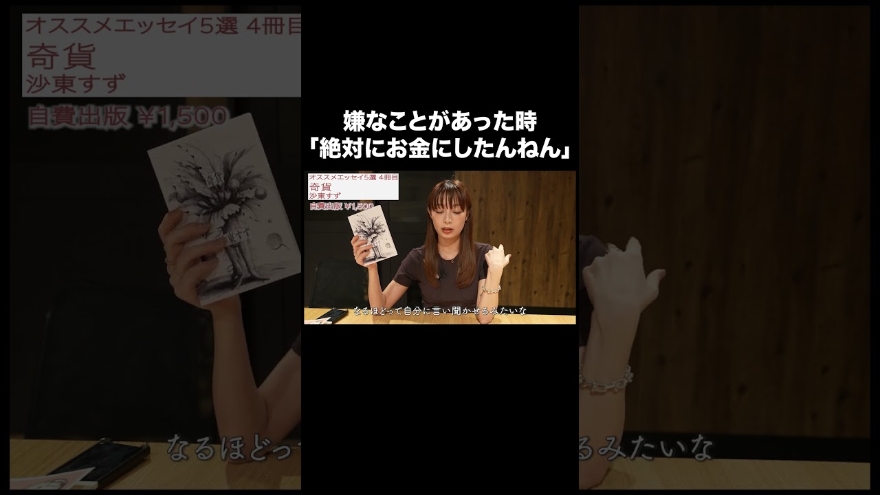私もどっちかっていうとなんかもうわってなった後それをあもいかにしてエッセにしてやろうかとか絶対お金にしたんねんて思うんですよね。嫌なことがあった時に [音楽] うん。 エッセに書くとか、ま、とりあえず日記に書くとか何でもいいか言葉文章にして文章にすることで形を作って、あの名前をつけて なるほどって自分に聞かせるみたいな。なんかそのそれそのなんて言うのかな、ある種の自分に対するなんていうかこうケア うん。を見てる感じがしてめちゃ面白かっ た