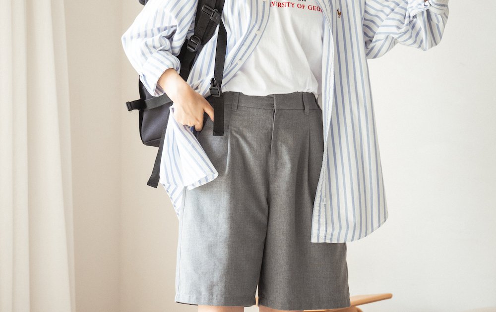 「これからの季節らしさが出しやすいグレーにさわやかなブルーをトッピングした、初秋コーデ。重たくならないように、ハーフ丈のパンツを選んで、クリアフレームのメガネで抜け感をつけたところがポイントです」