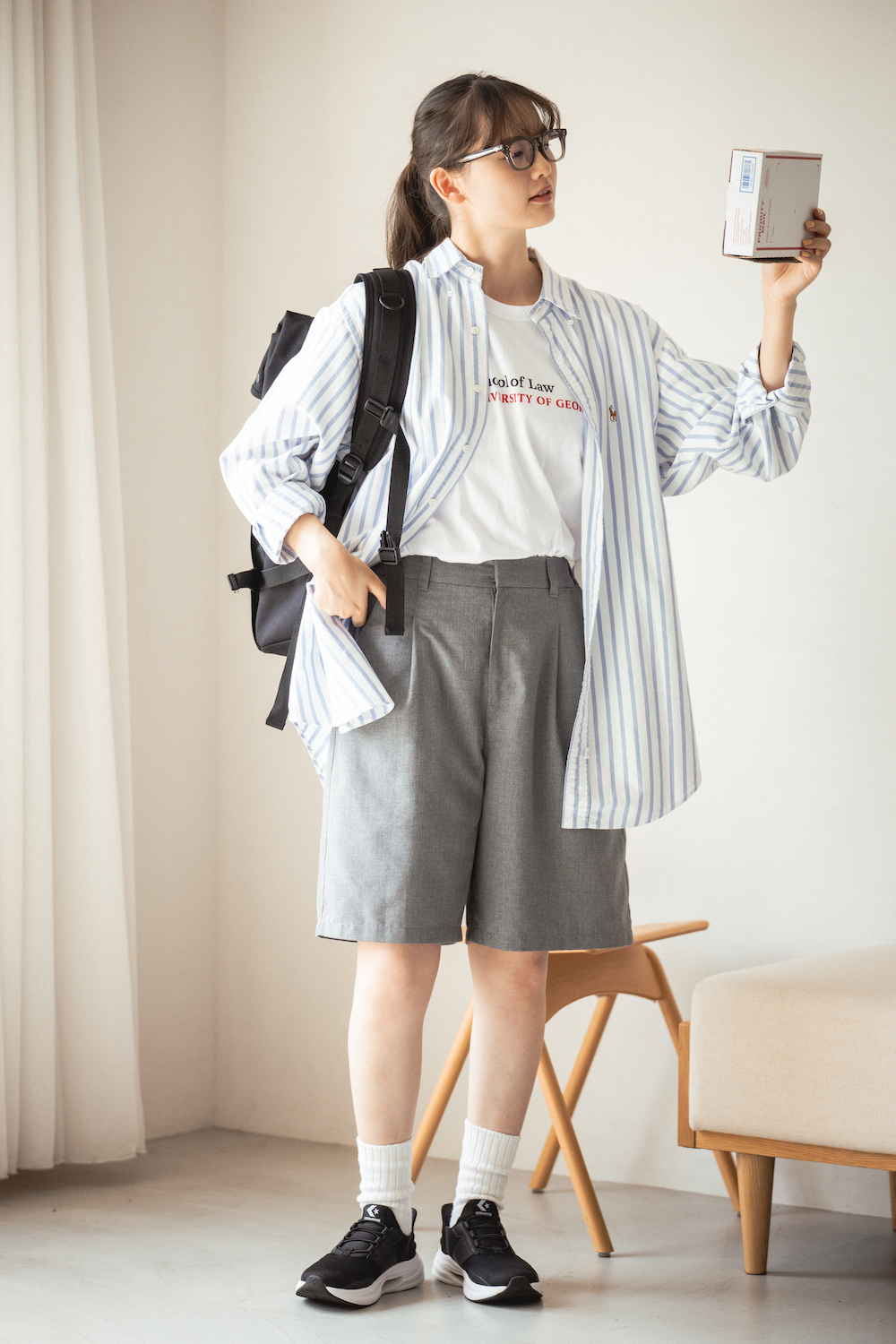 本人私物(ワイシャツ/polo Ralphlauren、Tシャツ/GEORGES 、パンツ/dot and stripes、靴下/靴下屋、シューズ/CONVERSE、バッグ/Manhattanportage、 メガネ/パリミキ)