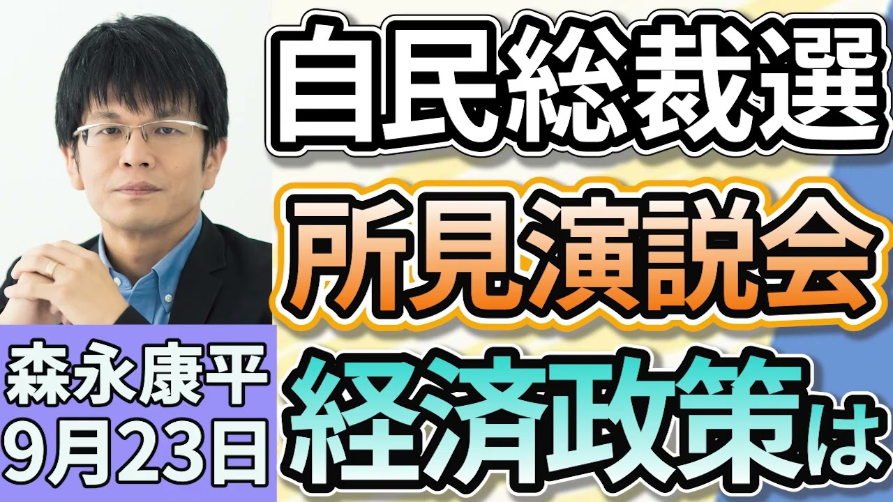 森永康平「自民党総裁選、立候補した5人が決意表明、経済対策は?」「日銀が年間3300億円ずつETF売却を決定、追加利上げは見送り」「日経平均株価 終値としての最高値を再び更新」9月23日
