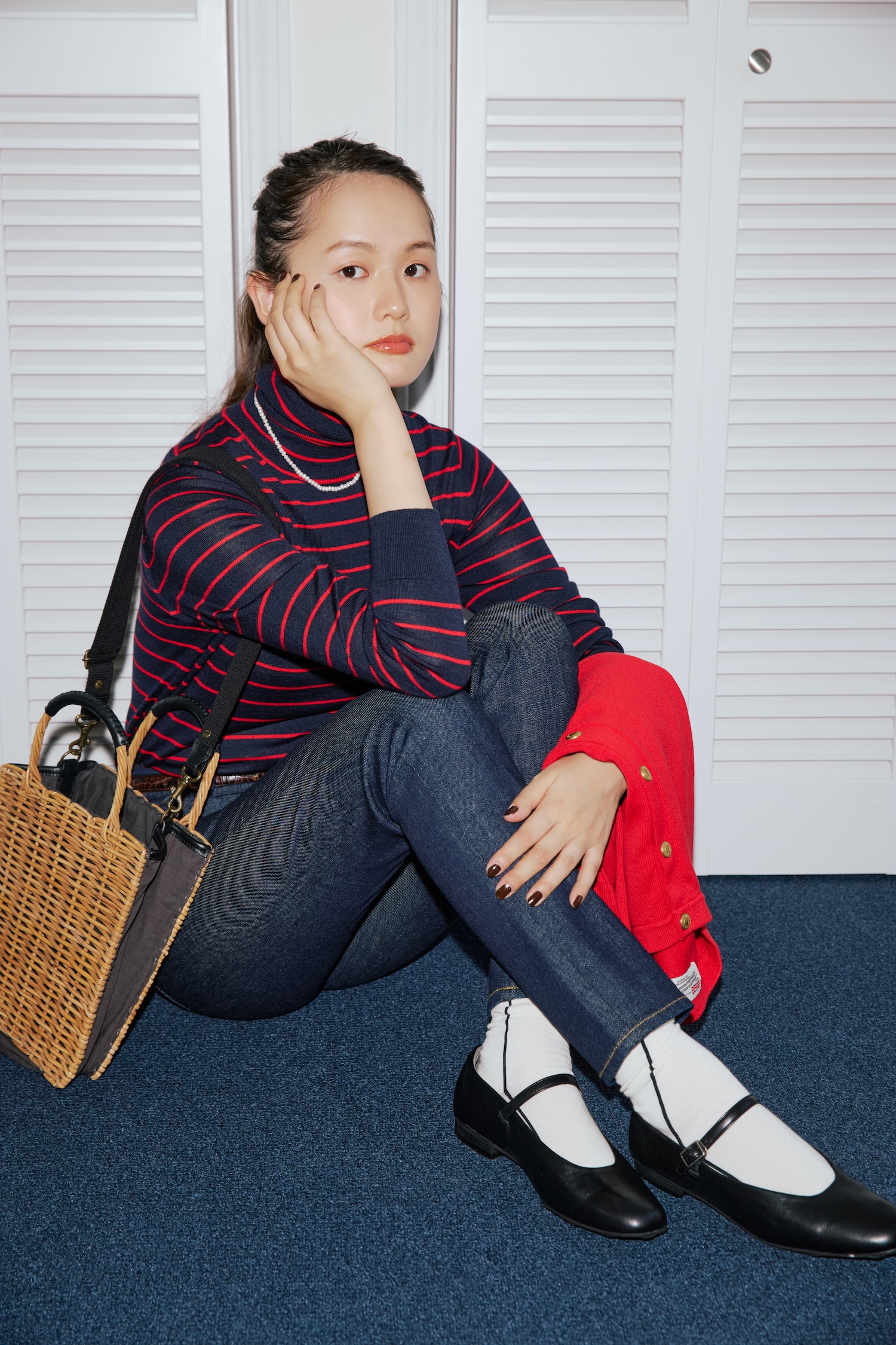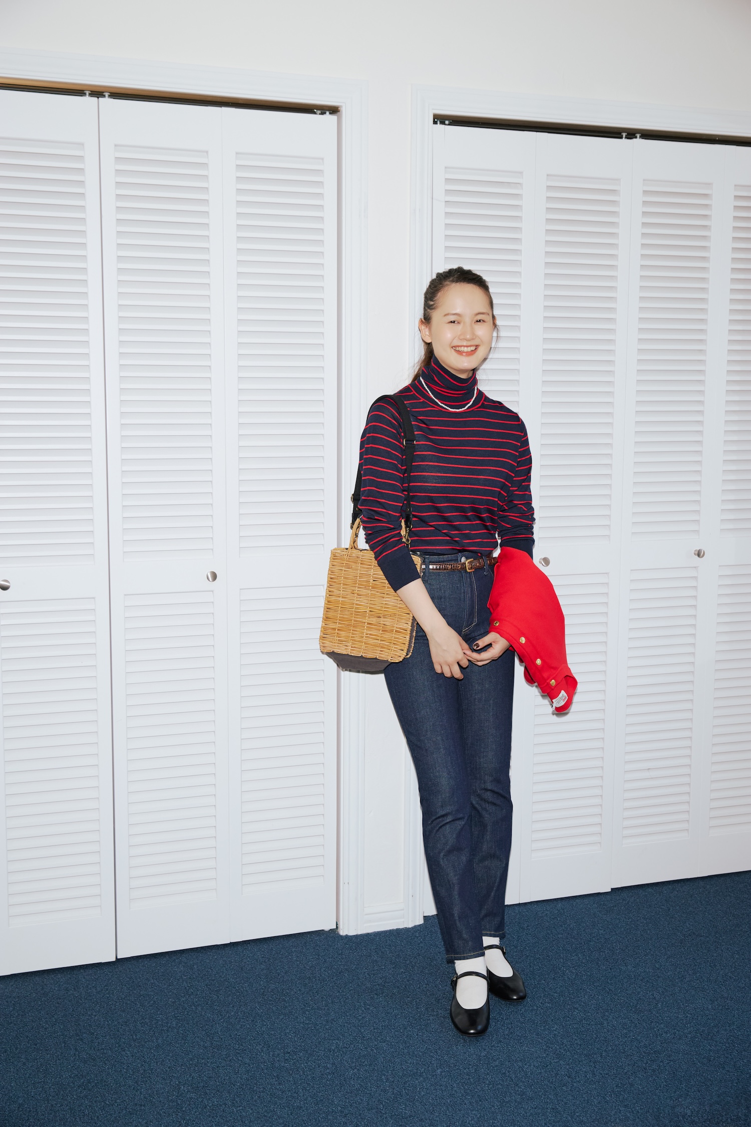 デニムパンツ¥30800/YANUK(カイタックインターナショナル)、タートルネックセーター¥27500、手に持ったジャケット¥31900/ともにTraditional Weatherwear(トラディショナル ウェザーウェア 渋谷店)、ネックレス¥4730 /Danae∴(スス プレス)、バッグ¥39600、ソックス¥2090/ともにLOISIR(ロワズィール)、ベルト¥11000/Scye(マスターピース ショールーム)、シューズ¥22990/MARGARET HOWELL idea(モーダ・クレア)