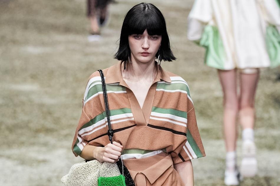 コレクションに華を添えるバッグ類にも注目。アイコニックなワイヤーバッグはマイクロミニサイズで解釈され、スタイリングにジュエリーのような煌めきをプラス。ハンド、クロスボディといった使い方だけでなく、ベルトのようにウエストマークするコーディネートも目に留まった。このほか、ラメが煌めくネットバッグや、今季の洋服と対応するマルチボーダーのワイヤーバッグ、上下逆で使える2WAYネットバッグなどが展開された。