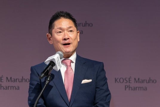 発表会冒頭では、代表取締役社長 本田英二が登壇。事業概要説明では、化粧品の研究開発に特化した「コーセー」がもつ化粧品的価値と皮膚科学領域に特化した「マルホ」がもつ医薬品的価値をそれぞれ活かし、「化粧品による日々のお手入れや肌トラブルの予防と、一般用医薬品による肌疾患のセルフケア。この両面から、トータルケアを提供すること」を事業の目的として掲げていると説明しました。