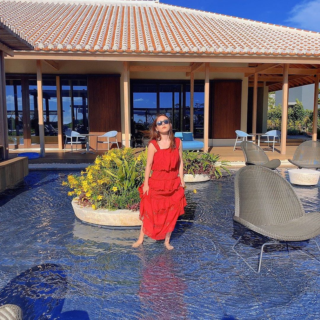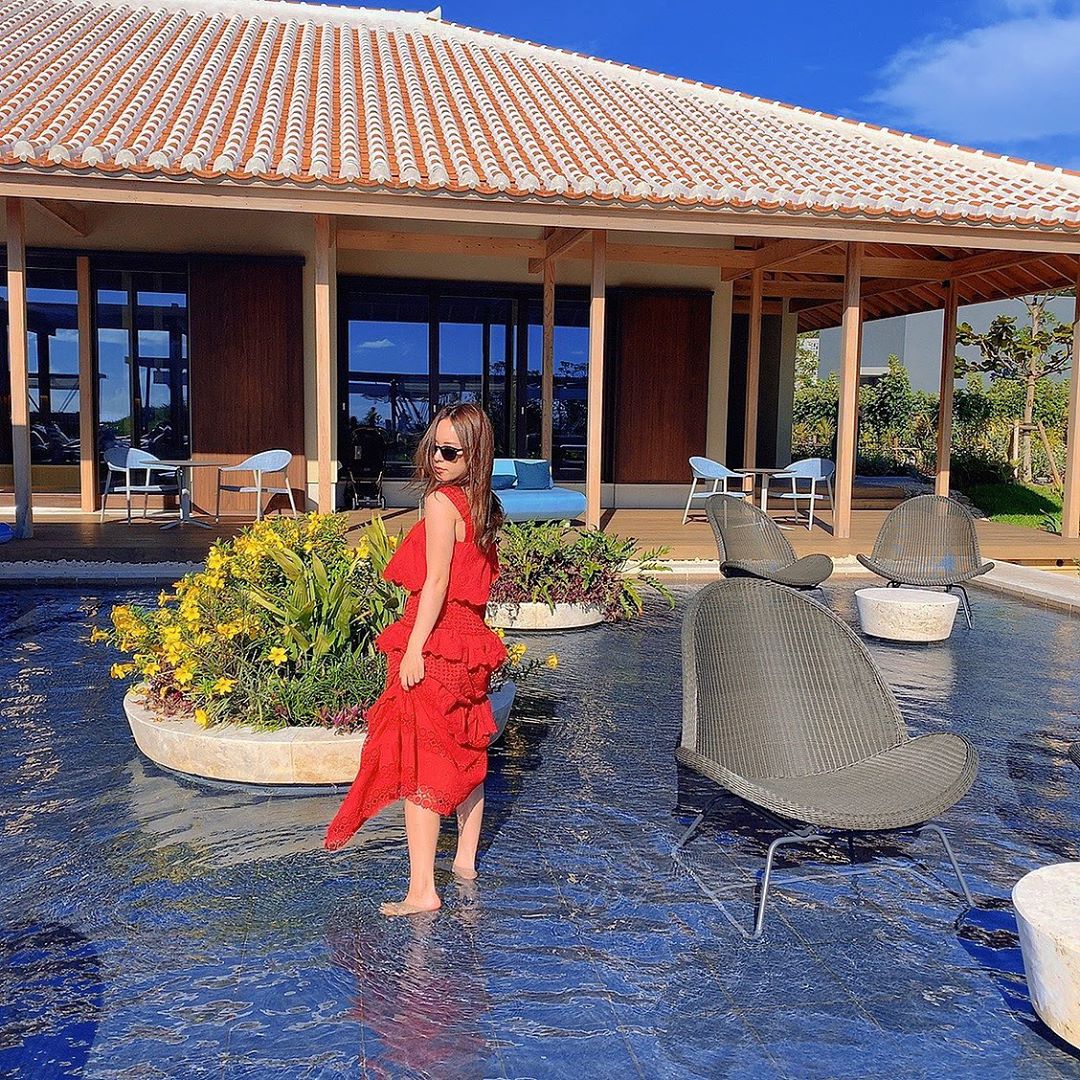ここ足首くらいまでの水位で、足水に入りながら座って寛げるんだよ🦀 あったかいところいいよね🥰 #ほしのや沖縄 #映えスポット #沖縄 #とりちゃん #risa_sekine#関根りさRisa SekineSekine Risaとりちゃんほしのや沖縄 映えスポット沖縄