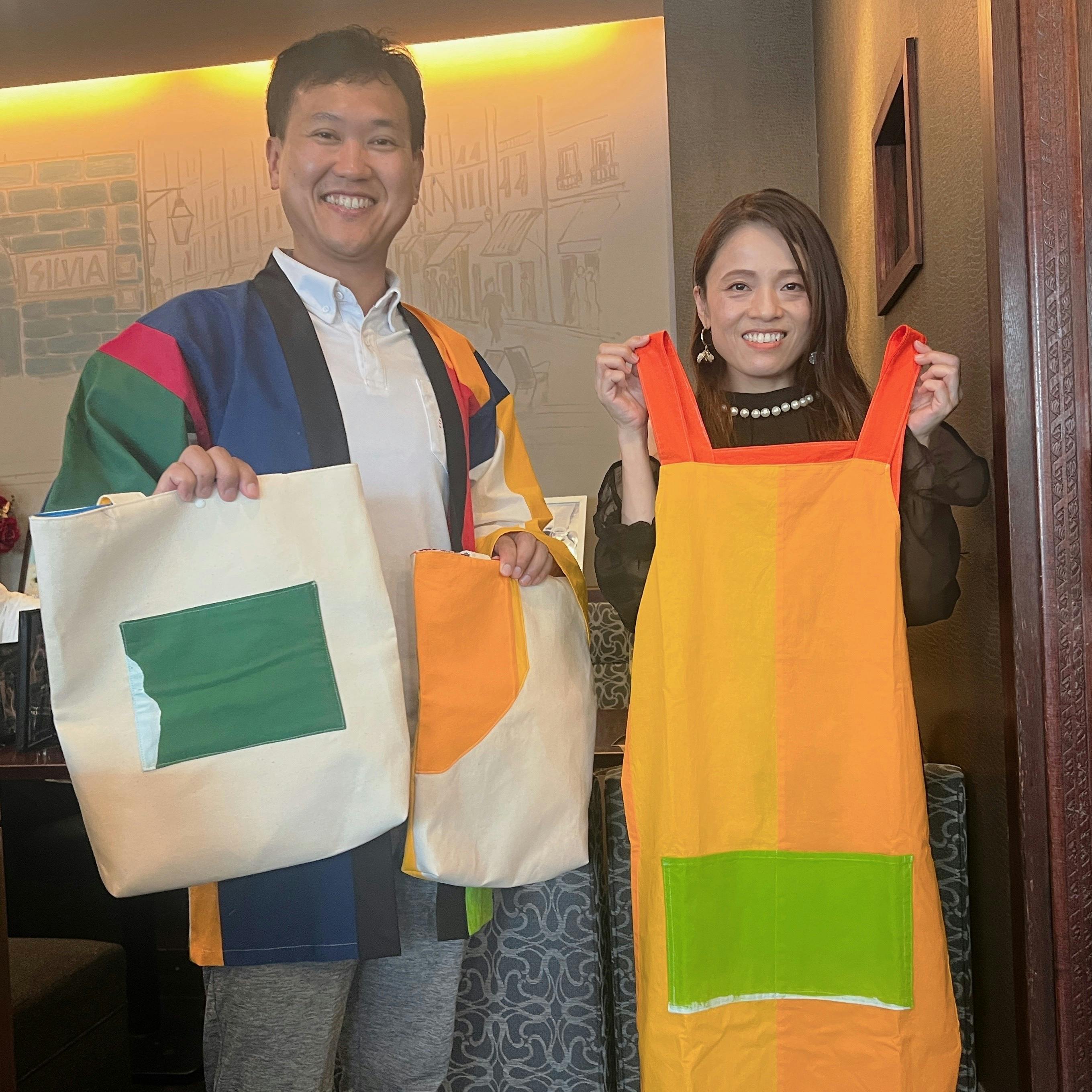 エプロン、法被(ハッピ)、トートバッグ、ポケットチーフなどを作成させていただきました✨