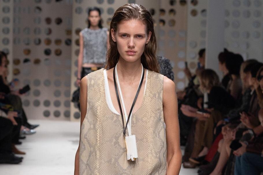 中でも目を惹いたのが、ジオメトリックな柄で彩ったショルダーレストップ&スカート。大判のスカーフを巻き付けているようにも見えるが、実はこれも柔らかなレザー製。背中で結び目を作り、バカンスを思わせる開放的なスタイルに仕上げている。