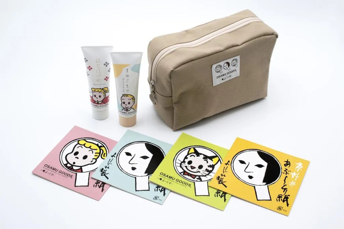 「よーじや」は、イラストレーターの原田治氏が手掛ける「オサムグッズ(OSAMU GOODS)」とのコラボレーションアイテムを、全国のよーじや店舗および公式オンラインショップなどで取り扱う。定番のあぶらとり紙やハンドクリームのほか、限定ポーチもそろえる。