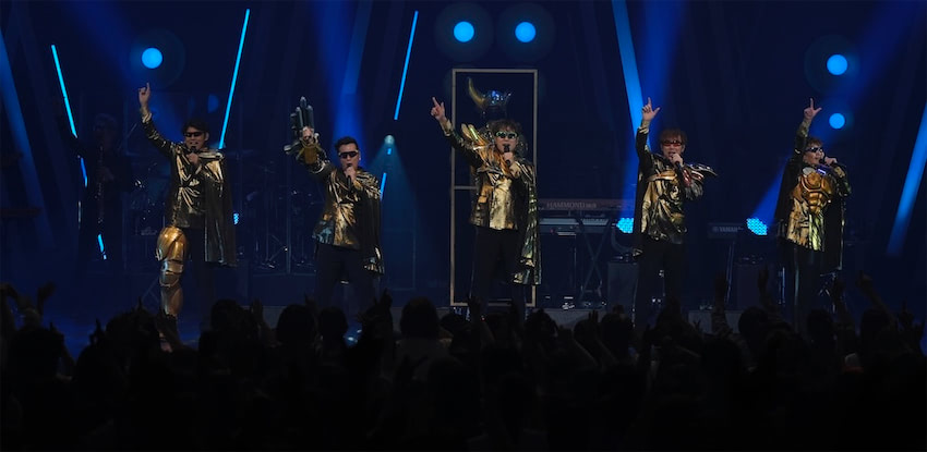 突如ステージが真っ暗になり雷音が鳴り響くと、ファンの中で崇められている愛の化身”Mr.LOVE MACHINE”が黄金の仮面とマントを纏い登場。「LOVE MACHINE」のイントロが流れ、Mr.LOVE MACHINEの魂のDNAを受け継いだ”Super LOVE MACHINES ∞”の5人が様々なパーツとお揃いのマント、メンバーカラーのサングラスを着用し登場した。バンドメンバーもサングラスを掛けて一緒にステージングをする演出も飛び出し、会場の盛り上がりも最高潮に。改めて”Super LOVE MACHINES ∞”のメンバー紹介のあと、「終わらない世界 2009」へ。冒頭歌詞の”終わらない”を村上、”世界へ”を黒沢がバトンタッチで力強いロングトーン歌唱を繰り広げると、さらに会場の熱気があがり、文字通り灼熱の空気に包まれた後半戦を締めくくった。
