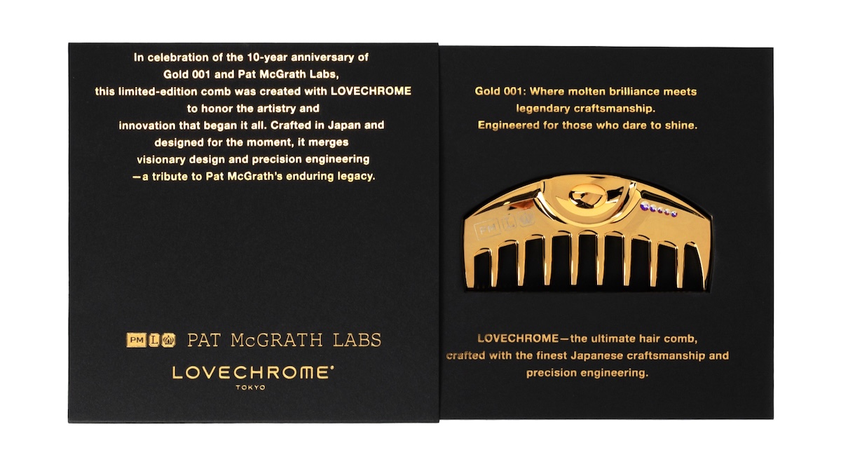 同企画は、「パット マクグラス ラボ」のアイコニックなアイシャドウシリーズ“ゴールド001”の誕生10周年を記念したもので、パットの周年プロジェクトである“ゴールデン ラグジュアリー ボルト”の一環として展開。「ラブクロム」を代表する“K24GPツキ ゴールド”と“K24GPウエービーツキ ゴールド”に「パット マクグラス ラボ」のロゴを施し、日本の繊細な技術と美しさを表現する造形にこだわった紙製パッケージに包まれた、特別仕様に仕上げた。24金を含む滑らかなコーティングと髪を労わり艶やかに仕上げる「ラブクロム」の技術に“ゴールド 001”を象徴するゴールドカラーを重ねた特別モデルがアニバーサリーを彩る。