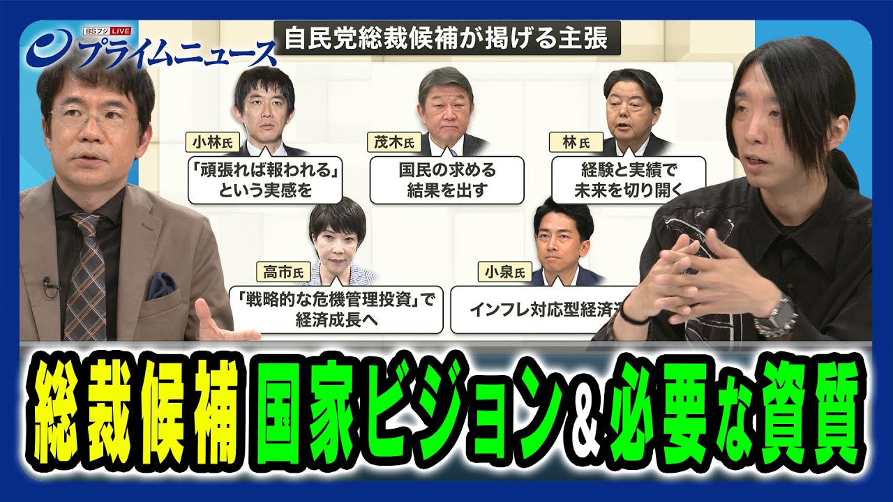 え、総裁戦の討論会で各方が掲げた主張を こちらにまとめてみました。 え、まず小林市は頑張れば報われるという 実感を表民の求める結果を出す。林市は 経験と実績で未来を切り開くを掲げ高一市 は戦略的な危機管理投資で経済成長へ。 小泉市はインフレ対応型経済運営を掲げ ました。 先さん、この各候補の主張どのように受け止められますか? うん。ま、1つ1 つについてコメントするっていうのは、あの、ちょっと避けようかなっていうか、あの、あれなんですけれども はい。 ま、例えば高一先生が戦略的な危機管理投資っていうのはこの番組でも、あの、ご一緒した時 1月でしたかね、お話したんですよね。 要するにこの地震とかいろんなことの災害大国の中でそれを劣人化するっていう自分たちを守るっていうことが同時に成長産業につがってくんだよってこういう話をしていたはずなんです。 はい。 ただ僕そのに聞いたこと、あの、お伺いしてあんまりうまく答えていただけなかったんですけれども、ただ僕があの社会保障の問題とか安全保障の問題っていうのは常に両輪で考えた方がいいですよって出張しているのはその経済成長の戦略としてはあの受け入れられるんだけれども多くのですね医療関係者とかそれから保障とかのことを勉強したりとかしていくとその経済成長で賄えるのよです ね、急速に高齢化していくこの社会でどうやってこう膨らんでく固定費社会保障の財源を含めてどうするんだっていうこと。これを一緒に喋っていただかないと はい。 なかなかそのですね、人を説得できないんですね。成長って夢だけ見させていただくのはいいんですが、だけど実際固定費があ、それを超える形で上がってく時にどうするんだってことがあります。 それで言うと、あの、小林候補がおっしゃっていたことですけれども、ま、防衛費が 2% では全然足りないから上げていくんだっていうことをおっしゃるのはいいと思いますし、 私はあの小林候補はあの 1 年前に比べるとあの話の迫力であるとかそういうことも含めてあの偉そうに言いますと随分成長なさったなっていうか、あの、腹が座ってきたなっていう成長を 1番この5 人の中では感じているんですけれども はい。ただそこでですね、あの、保守系の 表を取りに行きたいということで防衛費を ですね、え、2%から大きく上げてくん だっていうお話をするのはいいんですが、 そうした時に今言った社会保障の問題と どういう風に見るのか、つまり国家の全体 のこの予算とかですね、国家像の中でどう いう風に安全保障が位置づいてるのかって いう話をするってことはもう1つの安全 保障、生活の安全保障である社会保障の話 をしなきゃいけないんで、こういう 風な順序で喋っていただかないと何かを 1つ1 つでこうやりますよ、これやりますよ、これやりますよって 色々出されるんだけどそれがちゃんとしたこう 1 つのストーリーの中に位置づいてるっていうところをご説明いただかないとなかなかその昨日聞いたそれでわってなるからあっていう風に思われてしまうていう風に思ってまいます。 先日はあの日曜日にそのせ、あの総裁法 5 人の討論会を、ま、日朝の番組でやったんですけども、その時小林高さんにまさにその 2% 以上の防衛費どうするんだっていうの話を聞いたらその財源はまず税の上、え、上積み分、上のせ分、あとは再出削減、ま、そういったことをやっていて出するってことで増税ってことはっきりはおっしゃってませんでした。 そこもトータルで含めてビジョンをやっぱり出していくべきというお考ですか? で、今みたいな話をするとすぐにやれ増税するのかしないのかっていうので翌習以降ディアがジャックされるじゃないですか。だからそういうことをするのではなくってその安全保障に対してそういう財源なんですか受け入れますよ。 で、それについては本当に権学の議論が 実際に起こられるんだと思いますが、 じゃあ社会保障っていうのはどういう 立付けで組むんですか?で、我々の国に おいては1番他人他国から暴力を受けない ことが大事で、その次はあ、ですね、国民 会保険制度も含めたこの立付けで作ってき た反正期上立っているこの保障でやってる んですよねって、この2つが僕はあの インフラみたいなもんだと思っているので 、その組み立ての中でどうするかビジョン を1回語っていただいた上でじゃう 実際財源どうなのかっていうところの話をしてほしいていうことです。全体 それはまさにその全体像という意味ではそのこれから日本という国家がどういった方向性いのかっていう指針ということにもなりますよね。 そうですね。だからあ、もうちょっと小ぶりな話で言うとさっき言ったことと繋がっていて自民党が 70 年前の考慮を振り返て自分の党の話をすると同時にね、同時にこうあ全衛的なあ形での SNS 対策をやるっていうこれと同じことですよね。 うん。おさんはいかがですか?この5 人の掲げてい