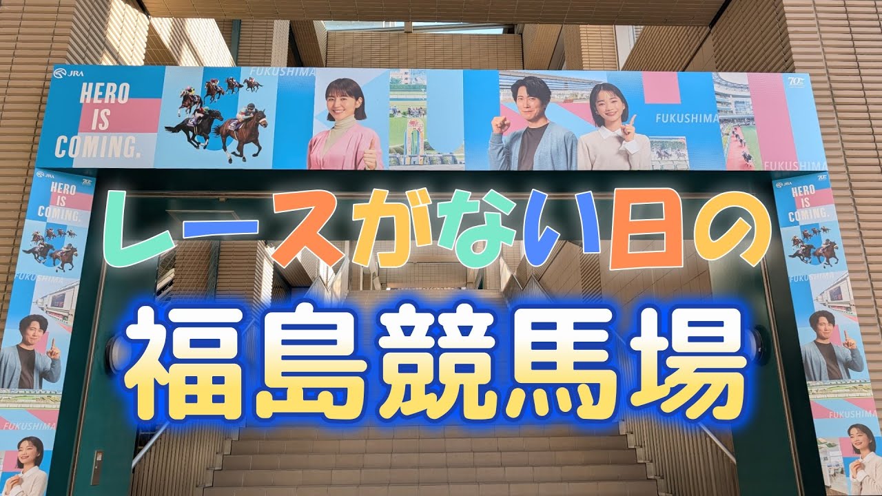 [音楽] こんにちはタカスです今日は特にレースは ないのですがJRAの福島競馬場を見に来 てみましたここもまた巨大なスタンドです ねJRA福島競馬場 誰も人がいないと設備の広さが際立ちます ねレースのない日いわゆる旧祭日の競馬場 がどんな感じなのか見てみたいと思い [音楽] ますパドックは2階にあり ます福島競馬場は敷地自体が狭いことから 2階にパドックが配置されたそうです [音楽] 福島競馬場は1周1600mの酵素を備え 収容人数は3万8617ドル [音楽] [音楽] 馬券は変えるし快適だし飲食店もあるので フラッと立ち寄るのもありですね福島競馬 場にもキッズスペースがあります [音楽] ね福島競馬場のスタンドもやっぱり大き すぎて画格に収まりませ んすい ちなみに日は屋内席も無料解放されてい [音楽] ますレース開催日には想像できないぐらい のどかな光景が広がってます ね [音楽] 12メモリアル コーナー競馬場の模型や馬の像などの他 福島競馬場線上に活躍したマザ元の絵など 様々なものが展示されています競馬ファン 必見の施設 ですすいません僕は競馬ファンというほど ではありませ [音楽] んターフィーショップ子供から大人まで 大人気のターフィーグッズを始め競馬に 関する様々なグッズが購入できるほした 展示物もありますグッズを買うなら混雑 するレース開催日よりも救済日の方が ゆっくり買い物できると思い ます競馬状としては狭いとはいえ広い です見ていただきありがとうございまし た帰り道に鉄をかった椅子を見つけまし [音楽] たB