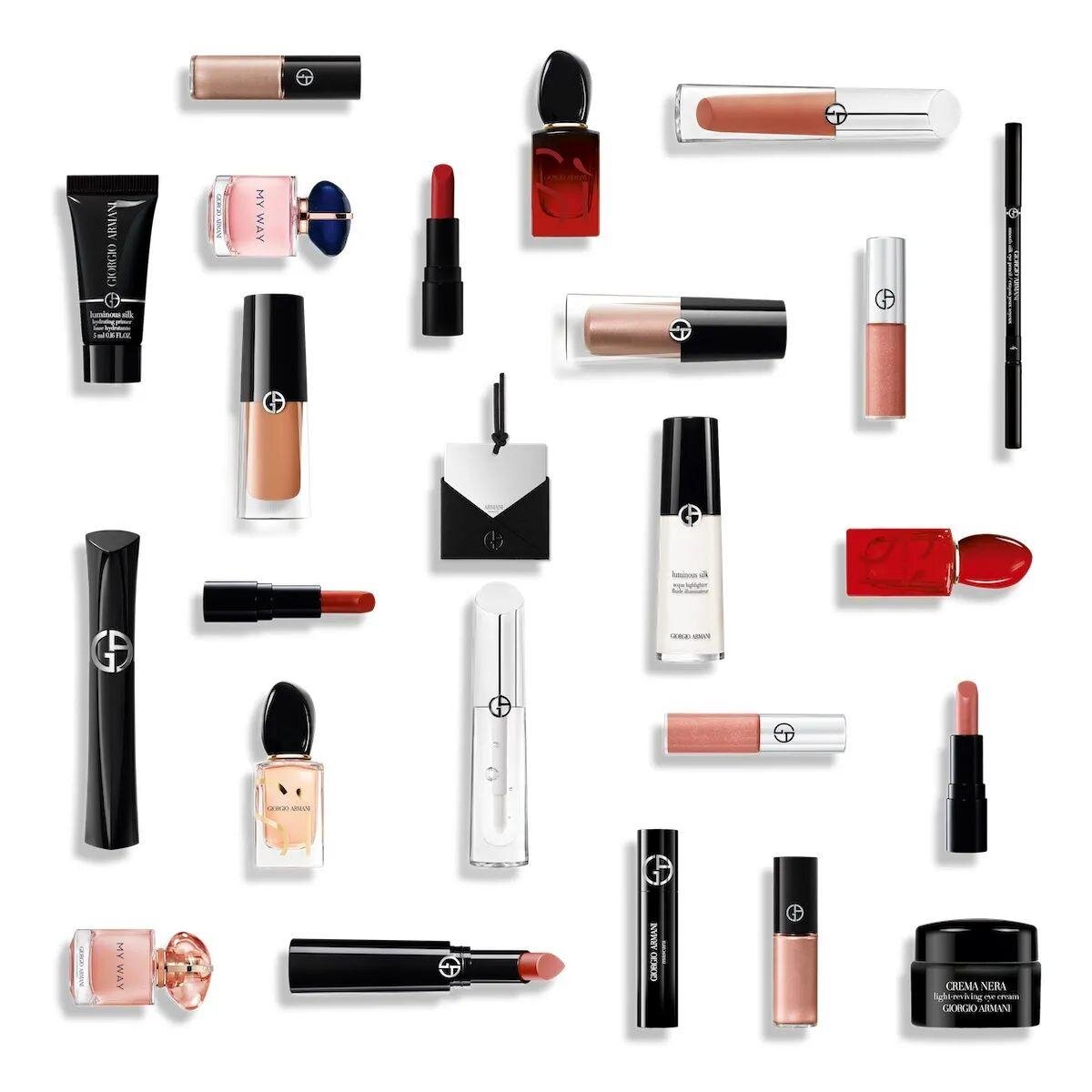 シィ オードパルファン 7mL、シィ パシオーネ アンタンス 7mL、シィ パシオーネ レッド ムスク 7mL(コフレ限定品)、マイ ウェイ 7mL、マイ ウェイ イラン 7mL(コフレ限定品)、アクア ディ ジョイア オードパルファン 5mL、ルミナス シルク ハイドレーティング プライマー 5mL、クレマ ネラ アイ クリーム N 5g、リップ パワー #104(コフレ限定色),#400、リップ パワー マット #400、アイ ティント #11S,#44S、アイズ トゥ キル #1 2mL、アルマーニ ビューティ オリジナル ミラー(非売品)