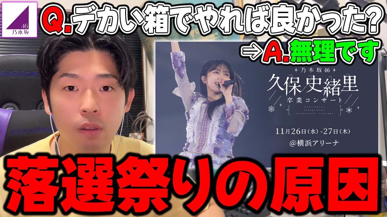 おす、どうもエディです。はい、という ことでですね、今回の動画なんですけれど も、ま、昨日久し寄り卒業コンサートの 到落発表あったと思います。ま、僕もです ね、一応動画出してますので、まだ見て ないよという人はですね、是非チェックお にしておいて欲しいんですけれども、ま、 その卒業コンサート皆さんも知ってる通り かなりの楽戦祭りになってました。もう 正直ね、なんで当たんねえんだよっていう 風になってたと思うんですけれども、ま、 今回、ま、この動画でですね、ま、この 楽天祭りになった原因っていうのをですね 、少し話をね、していきたいなと思います 。ま、実際ね、そんなにめちゃめちゃ楽戦 祭りになる原因ってあるわけではないん ですけど、ま、でも複数個のものが重なっ て重なって重なって、ま、楽天祭りには なってるのかなっていうのあるので、ま、 その楽天祭りになった原因一体何なのか ですね、今日は話をね、していけたらなと いう風に思います。ま、まだね、今回の 動画では話ししないんですけれども、これ からですね、え、2時とか一般販売とか あると思うんですけれども、ま、そこでも ね、ちょっと気をつけるべきこととか頭に 入れておいた方がいいよっていうのを今後 の動画で出したいなと思ってるんで、また これから久し寄りの卒業コンサート狙っ てるよという人はですね、今のうちに チャンネル登録であったり高評価ね、 ポチっとよろしくお願いいたします。では 早速やっていきましょう。 さあ、ということで、まずはですね、え、 今回久し寄り卒業コンサートが、ま、なぜ ね、これだけの楽戦祭りになったのかって いうのを話しておきましょう。で、まず じゃあどれぐらいの楽天祭りになってたの かっていうのを先に見せておきます。 こちらでございます。これ昨日ですね、僕 がアンケート取ったやつになるんです けれども、全落ちの割合65%です。 めちゃめちゃ落ちてますよね。10人 申し込んで少なくとも6人ぐらいは落ち てるような状況になるんですよね。当選 する人の方が少ないというような状況に なってます。ま、ここにですね、両日当選 みたいな感じで書いてるんですけれども、 ま、おそらく2日とも当たった人ってマジ でいないと思うんで、これはちょっとね、 ミスだと思います。あくまでどちらかが 当たるようになってると思うので、ま、 そこの3%をね、ま、どっちに降ったとし ても、ま、結局6割ぐらいは落ちてるよう な状況になるということですよね。で、ま 、当選してる人ねに関してはこれで見ると 、ま、30%ぐらいになってるので、ま、 ちょっとここのね、両日当選に入れたよっ ていう人が、ま、果たして本当なのかどう か、ま、そこ次第で、ま、ちょっと変わっ てはくるんですけれども、ま、でも40% はいかないかなというような感じになって ます。ま、投票としてもね、1300票 ぐらい入ってるんで、ま、ある程度、ま、 信憑性とかはあるのかなっていう風に思い ます。ということで、ま、これぐらいです ね、やっぱりライブとしては楽天祭りに なってるというような状況ですね。 じゃあ、ま、この楽天祭りになった原因 ですよね。ま、ここを見ていくとまず1つ 目キャパですね。はい。これがですね、ま 、基本的には1番だと思うんですよね。 今回会場が横浜アリーナという会場だった んですけれども、キャパがマックスで 1万7000です。マックスですからね。 全部何も考えずに埋めまくった状態で、ま 、大体1万7000かな。席を振る活用し て1万7000になるので、ま、実際は こうもうちょっと少なくはなってくると 思うんですよね。だから、ま、それぐらい の規模のキャパということです。基本的に 東京ドームとかでやると5万人ぐらいは 入るような会場になってるんで、ま、 サイズ感的にはドームクラスの3程度と 思っておいたらいいかなと思います。ま、 ドムとかもね、5万人行けるって言っても 4万5000ぐらいで抑えたりとかって いうのもあるので、ま、やっぱり、ま、 1/3ぐらいかなっていう風に思いますね 。で、ま、このですね、1万7000って いう会場大きいのかって言われると相対的 に見ると大きいんだけれども、ま、乃木坂 として卒業コンサートをやるってなると めちゃくちゃちっちゃいんですよね。これ が、ま、例えば全国ツアーの一環で横浜 アリーナやりますとか、あとは アンダーライブで横浜アリーナやります。 スタンで横浜アリーナやりますとかって 言うなら別に小さいとは思わないです。 むしろ、ま、ちょうどいいサイズ感かな。 ま、ちょっとでかいかなっていうような 認識ですね。個人的には。ま、そんな余裕 でね、ガンガン埋めれますみたいな状況で はないと思うんですけど、ま、今回みたい なやっぱり特別なライブ、誰かが最後 迎えるとかね、ま、そういうのはやっぱり ね、この1万7000人希望って考えると かなりちっちゃいのかなっていう風に思い ます。ま、事実めちゃくちゃ楽戦祭