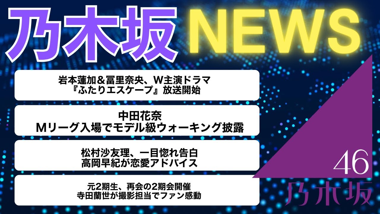 岩本連カ&トさと直w主演ドラマ2人 エスケープ放送開始乃木坂46の岩本連下 と富さがw主演を務めるドラマ2人 エスケープが10月4日より放送スタート する原作は田口小一師による同盟漫画で 可愛いが鳥江の無職先輩と締め切りに追わ れる漫画家後輩が日常から投避する様子を 描いたコメディ岩本は無職 現実当避のプロな先輩役富里は後輩役を 演じる。富里にとっては事情派ドラマ初 出演にして初主演策となる。都内で行われ た会見では2人が作品の魅力を紹介。岩本 はとにかくほのぼとした作品と語り、現場 ではアドリブを求められる場面も多かった と明かしたカメラ長回しの中でそのような 演技をして、これ大丈夫かなと思ったけど 監督から王OKが出て安心したと笑顔で 語った。一方富さは第1話の映画鑑賞 シーンでお菓子の袋を盛大に飛び散らせる ハプニングを告白。皆さんが笑ってくれて 温かい現場でしたと振り返った乃木坂46 の2人が自然体で望む新たな挑戦に注目が 集まる。 中リーグ入場でモデルウォーキング披労元 乃木坂46の中奈が10月2日に行われた 大和証券Mリーグ202526 試合でロングヘアをナびかせながらの入場 シーンを披露し、ファンの注目を集めた アイドル卒業後に麻雀会に転進し、 プロジャンシとして活躍する中田はこの日 は背筋を伸ばして奥側の卓へ歩く姿が まるでモデルのようで可愛い賞と小賛の声 があいついだ。自身3年目を迎えるM リーグでは過去2年のマイナスからの脱却 を目指し守備的なスタイルで個人プラスを 狙う試合は2着でフィニッシュし3戦終了 時点でトータル2.8芸能界と麻雀会での 二刀流としての存在感を改めて示した [音楽] 松村さゆり一目惚れ告白高岡が恋愛 アドバイス元46の松村が2日放送の テレビ朝日系番組あざくて何が悪いのに 出演し、自身の恋愛傾向を関らに語った 松村は結構一目惚れタイプですと証明し、 出会った瞬間に恋に落ちると自身を脳みそ プリンセスと表現一方で行為を伝える アプローチ法については予定が空いてる風 に見せちゃうと告白し山里太 どうやってアプローチするのと質問を受け た俺に対しゲストの高岡崎はだめだよ そんなことしたらと助言忙しいからこの日 だけ開いてると見せる方が価値があると 説明し松村は逆が良かったんだと納得。 番組では松村の一目惚れタイプと独特の アプロー地方が笑いを誘いながらも恋愛の 心理テクニックとしても話題となった。 [音楽] 元2期生再会の2期会開催寺田ランゼが 撮影担当でファン感動元乃木坂46の鈴木 が2日自身のInstagramで2期生 の再開会2期会の様子を報告した最初に 投稿した堀ミナは久しぶりに集まろうって なって2機会開催とコメントし鈴木佐々木 こと西川七 内舞野 ひなこが集結した集合写真を公開。時間が あっという間に流れ、こうして大切な仲間 がいることを幸せに感じたと振り返った 鈴木も日程の合うメンバーで集まってご飯 を食べましたと報告し、またみんなと 会える日まで頑張りますと綴った。さらに 写真の撮影は2021年に卒業し芸能界を 引退した寺ラダンゼが担当。SNSでは2 期生尊い撮影者がランゼちゃんで涙エモい と反響が相いつぎファンにとっても感動的 な再開となった。