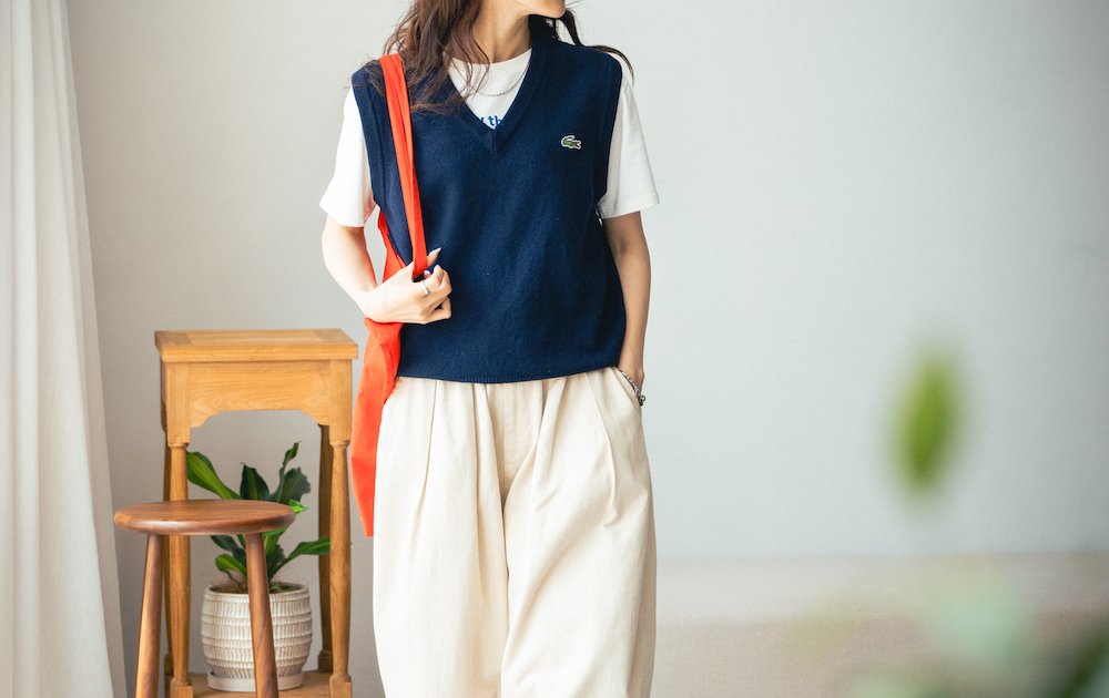 「履くだけでベーシックなコーディネートでも今どき感が生まれるバルーンパンツは、最近のお気に入り。まんまるシルエットが可愛いです。ベストを重ねてカジュアルになり過ぎないようにしました。もうそろそろベストの出番だよね!」