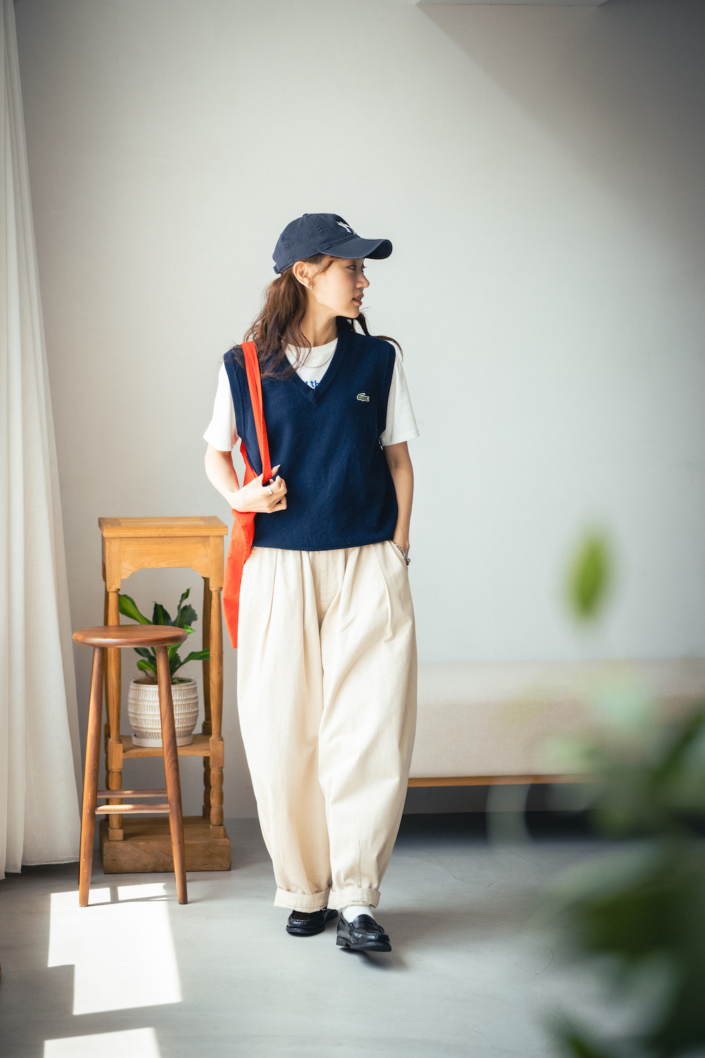本人私物(キャップ/NEWERA、Tシャツ/Chillfar、ベスト/LACOSTE、パンツ/HARVESTY、バッグ/HAY、ローファー/G.H.BASS)