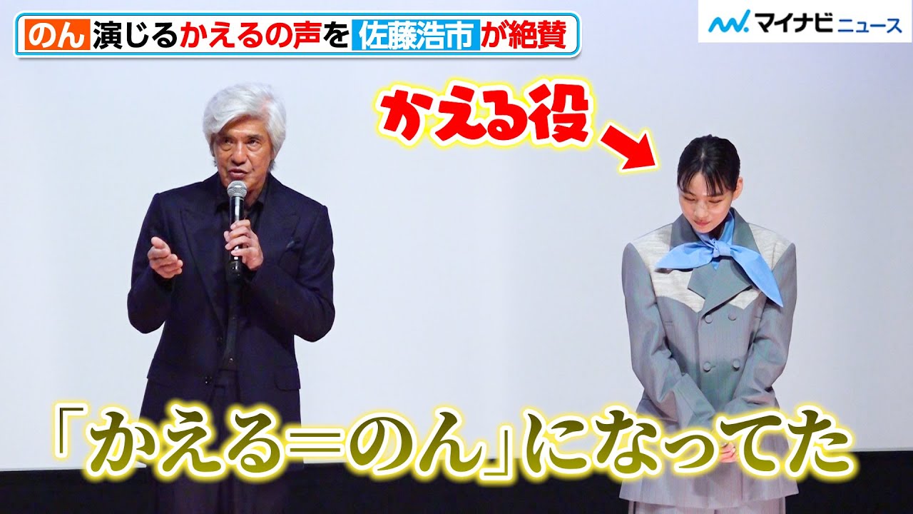 カエルの役っていうの初めてでしたので、 これはノンさんじゃないかってなりまして、 朝ドラでは とてもお世いになったんですけど カエるイコールになってた。 もう少しお願いします。よろしいですか?はい、ありがとうございます。 そして佐藤小一さんが演じてらっしゃる パートはですね、主人公になってるパート は続カエル君、東京スクーというタイトル がつけられているんですけれども、原作 からこう時間が経って2025年の世界を 描いたオリジナルの物語。 こちらオリジナルになるわけですが、身長 2 以上カエル君さんあったと思うんですけれども、このお芝居で大変だったことですとか、こう、カエル君との共演で特に印象に残っているのはどういったことがありますか? いや、ま、あの、一応最初から分かっていたんで、ま、で、声ものんじゃがるで実際それで、ま、現場では当ててくださる方がいるのとで一応、ま、あんまりこういうこと言う と夢がなくなるんだけど、CG 補正をする前の着ぐるみのカエル君も来ていたわけで、え、実際その中に入ってらっしゃる方が 1m90 ぐらいありますよね。 うん。あの、バスケットボールもやられる、え、俳優さん。 そうです。 ですね。井さん。 うん。 で、そういう方がやっていただいて、 まあ、うん。 ま、それ、その、ま、それとちょっと質問 のあれなんだけど、全段的に僕は1番最初 に、え、監督からこれを映画にしたいんだ けど、これ読んでくれないかっていう、 まず僕のパートの短編を渡されたわけです よね。な、僕のロールのあれした。それを まず読んでもこれはちょっとチンぷンカプ でさっぱりわからない。 で、その後に原作、その後に原作を読まさ せていただいて、ああ、なるほど。そう いうことか。それでこういう形の続編を あれ作ってるんだっていうこととそれから 、え、4本の他の他のそ映画では連作に なるけど、それの4本の他の3分のその本 も読んで全体として読んだ場合にあ、 なるほどかということで納得ができたんで そこでま、あのカエル君 ま、どういう形であれそこで何が起きよう が僕はああまり同日にできましたけどね。 さんはカエル君という役が来た時は率直にどう思われたんですか? ああ、率直に カエルの役っていうの初めてでしたのであのどんな声なんだろうってすごくびっくりしたんですけど、あの新作の方のあの ぞ 映画になっている物語も原作も読ませていただい すごくあのカル君の役がえ救いになるあの 役だなと思ってこれは意外と責任重大なの かもしれないと思ってあの 頑張ってみようと思って あと井上監督だったので以前あの朝ドで とてもお世話になったんですけどそそいう あの繋がりもあり、あ、これは安心して 飛び込んでみようと思って やろう思いました。 あの、結構他の役柄を見てくとこう戸惑い を抱えてたりとか、こう自分の中に、ま、 空っぽな部分があると実際に言葉で空っ ぽってワードも出てきますが、カエル君 だけはこうまるでヒーローのように直線に 1つのことに突き進んでるような印象が あるんですが、ノンさんで意識したことと かあとちょっと鳴き声が入ってたり、あれ はノンさんのアレンジかエルの泣き声 うん そうですやりましたよね。 やりましたね。色々試しましたね。なんか、あの、ま、気をつけたことは、あの、その井上監督と以前ご一緒してた時は全く違うムードの作品だったのね。なんかこうこういう火力みたいな作品取る時どんなモードなんだろうと思ってなんかこうちゃんと緊張感を持っていこうと。 [音楽] うん。いお持ちで うん。 レコーディングに行きました。したらもうなんか変わらず井上監督ワールドで警戒であの明るい演出を頂いてたのでなんかすごい楽しくノりノりでやりましたね。 あとはあの佐藤さんの演技に集中すること をすごく気をつけてました。あの映像を見 ながら演じることができたのでこう佐藤 さんの演じる間だったりとか息遣いだっ たりとかなんかそういうのをあの敏感に 感じ取りながらできるように集中してまし た。 逆に佐藤さんはこうノさんの声が当てられたカエル君をその後ご覧になってどんなことを感じになりましたか? ま、それはだから彼女がどういう風な覚悟を持ってやるかなっていうのは最初に思っていたわけで、ま、そこ中でやっぱりあ、自分がこれではいけないんだってことを色々気づきながらやったなっていうぐらいなんかそういったことを感じられるぐらいすごくそのカエルイコールになってたっていうのはあったなっていう [音楽] ま、それ上から目線で行っちゃ申し訳ないけど、ま、でもそれぐらいなあれを感じられたんで、ああ、すごく良かったと思いましたね。 ですね。あの、井上監督は今回、ま、ノンさん またご一緒されていますし、あの、麻でもご出演されていた橋本さんも昨索ね、ご出演されてますが、なぜカルの役ノンさんだったんですか ね?えっと、そうなんですよ。 あ、ま、でもスタッ