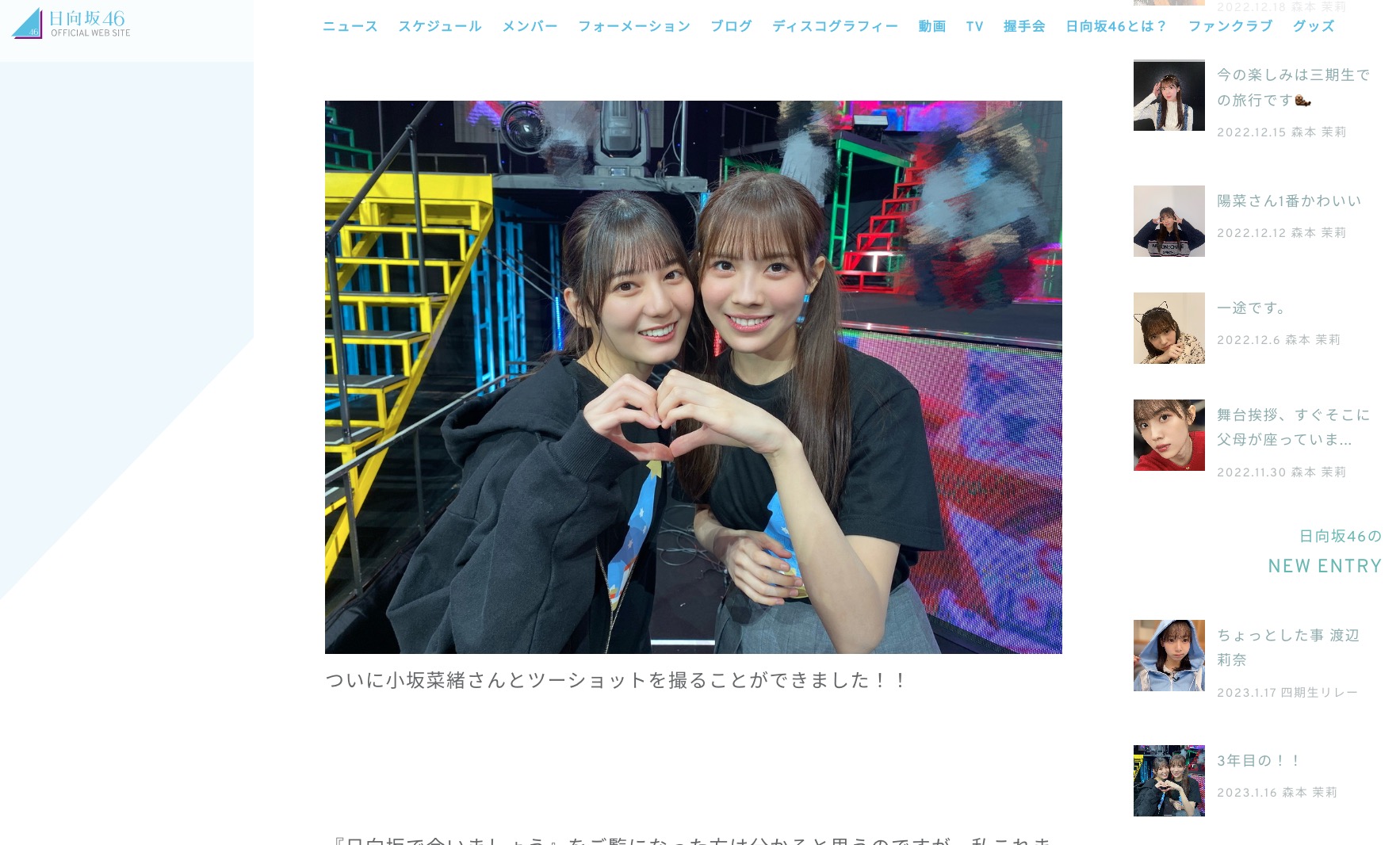 ブログは「なんとですね、、、 ついに小坂菜緒さんとツーショットを撮ることができました!!」という報告から始まり、「『日向坂で会いましょう』をご覧になった方は分かると思うのですが、私これまで菜緒さんと2人きりで写真を撮ったことがなかったのです」と続ける。冠番組『日向坂で会いましょう』(テレビ東京)1月8日放送回で小坂が、熱望していた森本に先んじて新しく加入した四期生と写真撮影を行ったというエピソードを披露。ブログにて森本は「「一緒に写真撮ってください」の一言がなかなか出てこず、ここまで来てしまいました、、。笑 沢山お話する機会も増えて、ひな撮とかも沢山させてもらっていたんです。でも、月日が経てば経つごとに逆にこの言葉が言いにくくなってしまい。笑」と、3年間撮れなかった理由を説明した。
