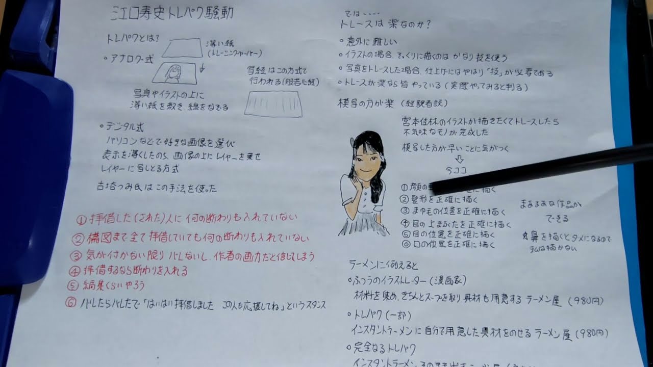 え、今日も江口久しトレパック騒動につい て、ま、解説をしていきましょう。という ことで、ま、イラスト書くの好きなんでね 、このこういう話題はですね、非常に 首まれてなんか気がすまないみたいなのが ありました。私の方ですね。で、それで ですね、ま、トレパックとは何なのかって についてもうちょっと確認していきたいと 思います。トレパクというのはトレシング パクリの略で縮めた言葉で和英語でござい ますが、え、トレトレースってのがその なぞるっていう意味でね、あのです。で、 アナログ式とデジタル方式ってのがあり ます。で、アナログ式って1番簡単にやり やすいんですが、どういう風にするかって 言うと、ま、写真やイラストの上に薄い髪 をき、ただ線をってくっていうですね、 こう簡単な作用なんですよ。ま、簡単なの かって、ま、簡単なた、簡単じゃんって人 は簡単だけど、ま、後で説明するけど すっごいこれ難しいんすよ。でもこれは これでで、ま、薄い、ま、写真やイラスト のように薄い髪ですね、トレーシング ペーパー、ま、一般的なトレーシング ペーパーです。あの、ペラパランパラン ペランペラの紙ですね。あの、うん、あの 、阪子、あ、集中で使う阪神あれが1番手 に入りやすい。え、大量に入りやすいで、 え、ブンブンあの、100均行くとあの、 半字用反種なんて多分あれ50枚1組で ボンと売ってますから、あれはもう ガンガン取り手に入れやすいので、ま、 あれが1番やりやすいかなと思いますが。 で、あれをですね、上に敷いてですね、 あの、ま、でもトレーシングペーパーが 一番嫌いですね。トレーグペーパーもね、 100均で売ってるんだ、あれ。うん。 売ってるんで。まあ、 ま、なんだろう。なんかな、あの高級な なんかお菓子和菓し買うと箱をパカッと 開けるとこう菓し を包み込むような感じでうっす パラペラペラなんかあの紙があるじゃない ですか。あれがトレシングペーパー 分かりやすく言うとでそれをしていくと あのやりやすいでま社教はこの方式で行わ れます。半若信って半若信っていうあの お経があってその上にうつい神しいて上 からただひたすらなるってこが社教です。 え、これがあの方式です。だてデジタル式 だとパソコンなどで好きな画像を選び、ま 、表示を薄くした後、ま、色とか薄くする のね。そうすると画像の上にレイヤーを 載せてレイヤーに移しとる方式。レイ アーっていうのはもう1レイアーっていう のはこれですね。パソコン出てこの紙 みたいな感じの上にもう1個そういそう ですね。あ、断層の層です。あの1層、2 層、3層の層ですね。え、その上に層を 重ねてその層重ねた層の上に線でこう ペンっとなぞっていくっていうもペン タッチとかでそでやってくんでしょうけど うん。マサでやる場合もありますし、ま、 色々な感じでやります。で、昔コ藤氏が 2022年の2月にですね、え、大騒動 起こしたわけですが、多分これはコトミは この公式を取っただろうって言われてまし てです。で、え口久しさん、ま、多分これ も多分同じ手使ったのか Androidで頑張って作ったのか ちょっとお分からないんですが、ま、でも あれインスタプになってるから多分 デジタル好きなんだろうなと思ってます。 で、何が問題なのかってやっぱ拝借された 人に何の断れも入れてないということが、 ま、昨日も説明した通りですね。え、です 。で、あの、それから構図まで全て拝借し ても何の断りも入れてないっていうことが 1つで、あの、気がつかない限りバレない し、作者の瓦力だと信じてしまう。これが 1番大きいんだな。 気がつかない限りバレないんですよ。で、 あ、やっぱりあの先生の絵はすげえなつっ てなるわけ。何にも知らない人だったら そう思うわけ。うん。だからそれで イラストとかに詳しいとか私もトレトレ やりますよみたいな人だったらあれこれ もしかしてトレスで書いたんじゃねみたい なあるんだけどほとんどの一般の人はです ねあ久しさんの枝ああやっぱ可愛いなって すごいうまいなって思うわけですよ。何も 事情知らねえから。知らねえからこれ別に ね。おすげえとなるわけですよ。で、 イラストもあんまりそういうイラストとか その漫画業界に詳しくないとああ、じゃあ あの先生に頼もうかって言って頼んじゃう んですよ。うん。頼んじゃいますよね。そ したらでやっぱりその知ら何にも知らない 人っていうのはやっぱ位置から書いてる もんだと思うわけ。やっぱり昨日も説明し た通り自分でインスピレーション で発想発想力で発送して女の子パーって 書いてでそれを色つけてあので 納品してると思ってるわけですよ。あ、上 には後ろに背景画像書いて納品してると 思ってるのよ。まさかね、元ネタになっ てる写真とか画像とかイラストがあるとは 思わないんですよ。いや、だってイライラ する旅行あんまりそんな詳しくないから 名前が知れてるだけでイラしてるわけだ からでもらった方