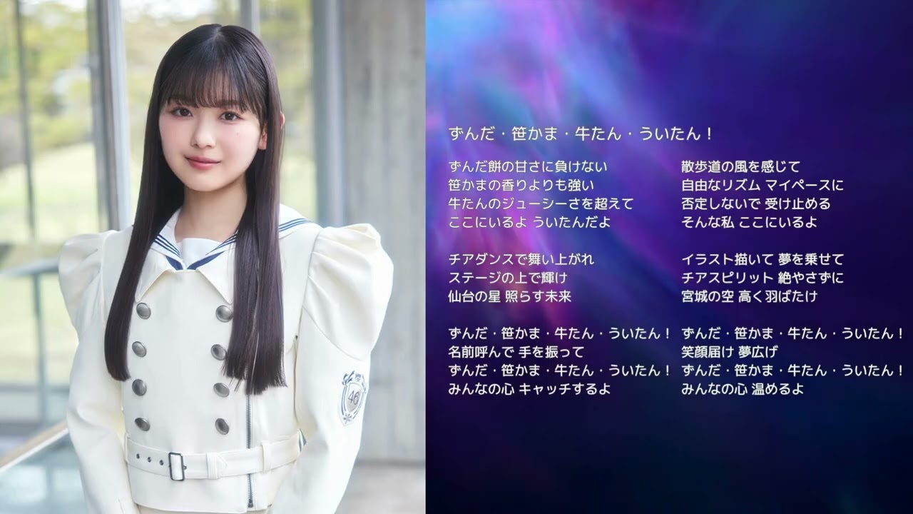 [音楽] 積んだの甘さに負けないさの香りよりも 強い の中視さを超えてここにいるよ浮いたんだ の 素で舞い上がれ ステージの上で輝け 仙台の星ラス未来 積んだまきたい 名前呼んでて 住んださ 浮いたみんなの心キャッチする [音楽] 散歩道の風を感じて自由なリズムス に否定しないで受け止める。そんな私ここ にいるよ。ラスを描いて夢を乗せて チアスピリット 絶さずにむやぎの空高く羽たけ 積んでさい [音楽] た笑顔届け夢広げんださ 吹いたみんなの心温める Ja. [音楽] [拍手] [音楽] [音楽] [音楽] [拍手]