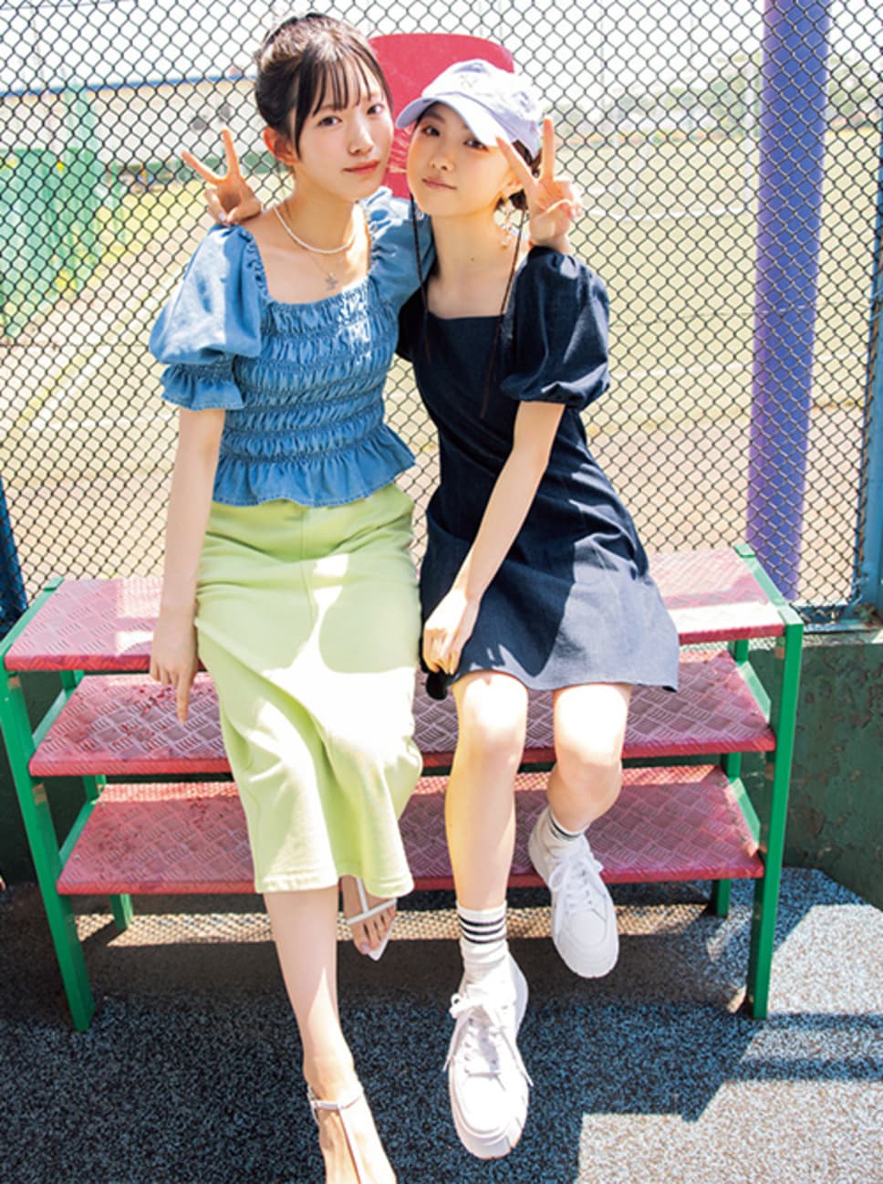 【村山さん】シャーリングトップス¥4939/アダストリア(repipi armario) ロングスカート¥9350/ヘインズブランズ⦆ジャパン カスタマーセンター(チャンピオン) ビジューリボンバレッタ¥36300/THE HAIR BAR TOKYO(レレットニューヨーク) パールネックレス¥550/パリスキッズ原宿店 シルバーネックレス¥14300/89xiiitokyo サンダル¥12650/ダイアナ 銀座本店(ダイアナ) 【谷口さん】パフスリーブワンピース¥12100/CALNAMUR キャップ¥4400(NEW ERA)、イヤリング¥4950(MABEL)/ROSE BUD ルミネエスト新宿店 スニーカー¥12100/プーマ お客様サービス(プーマ) ラインソックス/スタイリスト私物 ●商品情報はViVi2023年8月号のものです。