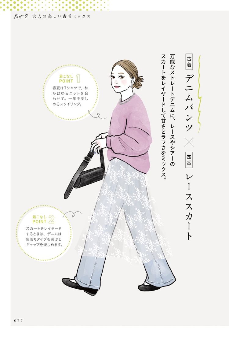本書は、古着やビンテージアイテムの着こなしを、大人の女性向けに提案。手持ちの服や新品の服に、古着を1点加えることで、手軽にこなれ感やオリジナリティーの演出を可能にする。近年、百貨店やセレクトショップでも取り扱いが広がる古着について、基礎知識からトレンド、着こなしや手入れまで紹介する。