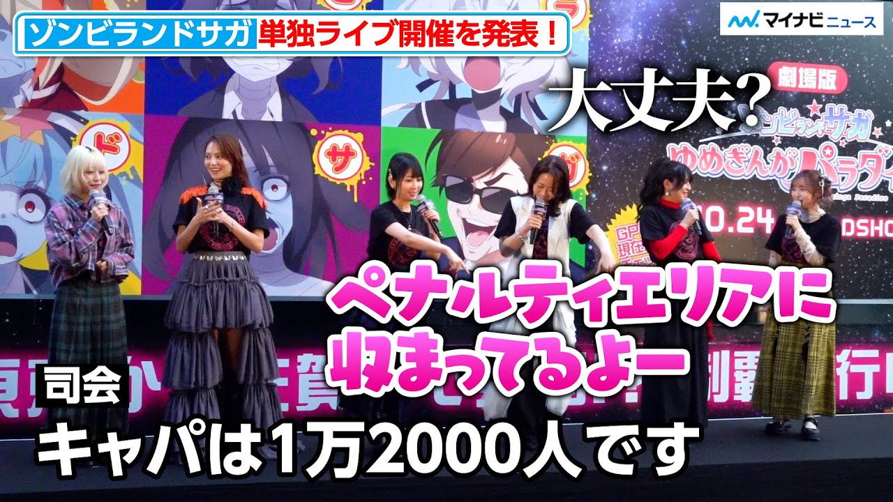 そう、重大発表があるからなんです。 ああ、です。 リアルライブゾンビランドサガライブフランシ夢銀河フェスティバルを 2026年4月に横浜のピアリーナ MMにて開催いたします。 素晴らしい。 で、え、こういう形で、え、ゾンビランサの映画盛り上げているんですけれども はい。うん。 え、映画公開も迫ってですね。 うん。 はい。 このゾンビランドサガから 今日せっかく皆さんに集まっていただいた はい。 というのにわけがあります。 おお。 うん。 なんだ。 今日重大発表があるからなんです。 あです。 ではですね、この大都会大東京の象徴の東京タの中心で東京制覇を名刺代わりにまず代表してですね、本土さんから重大発表をお願いします。 はい。皆様心して聞いてください。 私たちフランスはリアルライブゾンビランドサガライブフランス州夢銀河フェスティバルを [音楽] 2026年4月に横浜のピアリーナ MMにて開催いたします。 素晴らしい。 う、 おめでとうございます。 ありがとうございます。 え、こちらのライブはですね、 26年の4月4日土曜日と4月5日曜日の 2回公演 お2デイズ 単独ライブ開催ということで、え、 2021年の幕張ライブから 5年ぶりと5 年単独が 単独が はいね。 これはもう皆さんちょっとご心境の方を教えていただきたんですが、本田さんいかがでしょうか? いや、興奮しますね。 生きてるって感じがします。あの、あの、もうまもなくね、あの、別のフェスに出させていただくんですが、単独なるとやっぱりこう何を披露できるのかなっていうところもありつつ、 [笑い] やっぱりこうピアリーナ、 MM というとてもとても素敵な場所でやらせていただくので、 もうね、来てくれたみんながもう満足して帰ってくれるようなそんなライブにしたいですね。 うん。うん。はい。 どうですか? いや、まず率直にサガじゃないんかいとは思いますけれども、あのサガアリーナっていう大きな場所へ向けて、そして私も日本武道館でやりたいとはずっともう初期から言ってるんですけど、そこに私は向けてのピアリーナ MMだと思ってるので、あの、 5年ぶりに皆さんの前でこの 6 人で一緒にライブをやるっていう、しかも単独でやるっていうのは本当にあの、私たちも夢見ていたことなので、ファンの皆さ さんと一緒にピアリーナ MM でここがサガなんだって思う思えるようなライブにしたいともう今から生意き込んでおります。是非皆さん楽しみにしていてください。よろしく。 ありがとうございます。 種田さんいかがでしょう? いや、もうね、あの11 月のフェスに出させていただくレッスンとかが始まってるんですけど、 もういろんな覚悟を決めて、あの、挑んでおりますので、あの、皆さんも本当に映画を見た思いをあの、 4 月までずっと忘れずに、あの、熱を保ったまま是非来ていただきたいなと思っておりますので、どうぞよろしくお願いいたします。 ありがとうございます。川さん、どうすか? はい。 え、本当にフランス書の楽曲はもうどの曲も魂を込めてみんなで歌って踊っている楽曲なので、ちょっと正直あの恐怖けれどももうでも もう私たち死んでますのでもう死なない。死抜きでレッスンして皆さんが遊びに来てよかったなって見て良かったなって思えるライブに絶対しようと思ってますので是非応援しに来て欲しいです。よろしくお願いします。 [笑い] 木川さんはいかがでしょう? はいと5 年前だと確かコロナ禍でせあの声出しだったんですよね。最後のライブが確か で多分今回で声出し会禁 してもらえると思うので是非ぜひ皆さんの暑い声を送っていただけたら嬉しいです。よろしくお願いします。 田中さんいかがでしょうか? そうですね。 やっぱりライブこ開催ねるっていうのも本当に嬉しいし、やっぱ皆さんのね応援のおかげだっていうのもすごくあるし、あとはやっぱりそのままだ披露していない新曲も実はあったりとか、その 2 期が終わってからのこの映画の間にも出された曲とかまだ披露してない曲とかあったりもしますし、ま、もちろん劇場の歌なんかもやるんじゃないかなと思いますので、映画を見てその気持ちを高ぶらせたまま 4 月に私たちに会いに来てくれたら嬉しいなと思います。 ありがとうございます。キャ 1万2000人です。 ピアリーナは すごいツーデイズ 大丈夫大丈夫。 あ、あそこだけにならないです。 確かにペナルティに収まってるよ。大 ですかね。 それはそれでそれが言えるけど確かに そうですね。そういう意味で言ったらフランシ市場最大の ああ、 規模のあるより大きいんだ。 さあ、 おお。 マルも2回ですけど うん。うん。1 万人とかでしたっけね。 そうか。そうか。 確か みんな来てな。みんな 埋めてください。 埋めてください。 それもこれも全てはこの映画のね、ヒットにかかってるというとこ。 いや、本当にまさに 引き続き頑張っていかないかんなということなんですけど。 急に棒読みにした。 どうした?どうした? かんな なのでそのため