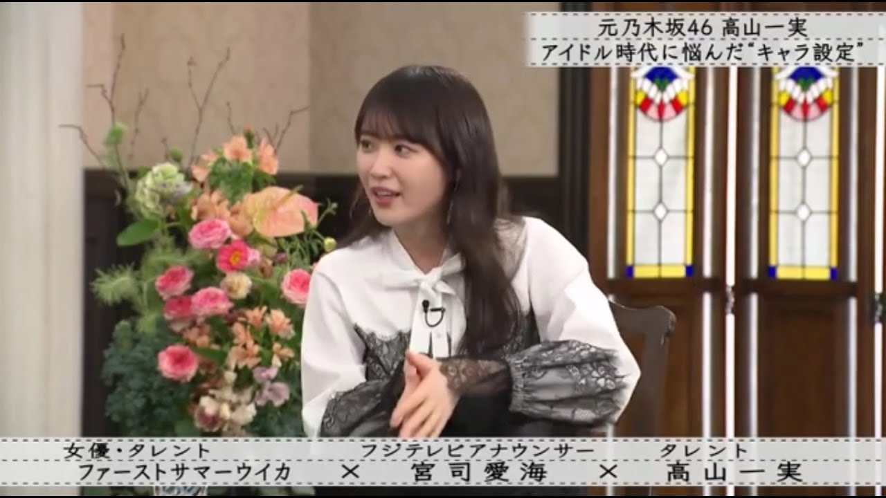 ま回してくださるからきっとお願いします。 いやいや、今日はちょアナウンサーとしてはちょっと仕事 1回置いといては 今日はね、 なんかみんなザックバラに話せれば 私ここの 2 人の関係をちょっと先に聞いてもいいですか? 確かに最近初めてお会いして そうなんです。ゆっくり喋たのはね、最近ですよね。 何繋がりなんですか? 4 年ぐらい前に潜在能力テスト収録にで一緒になってずっとかずみんが大好きだったんですよ。 その収録の時にはあはあって言って大好きですって言って いずれご飯行きましょうねって言って 4年経ってそう 出た出た あるあるですよね。 そうでこの前初めて共通の知人返してご飯一緒に食べて うん。私は顔がもう大好きだ。わかるわかります。 私なんか大学在学中のスナップとか勝手に保存してて 怖い怖い怖い怖い怖い怖いでしょ。な んでどこで見つけてきたの?そんな えルのネット上あるの まだちょっとこうウいしいさんいて全部めちゃめちゃ遊に入れて あそうそもそもウイカさんと仲良くなったきっかけが私が一時ご飯作るのにはまりすぎてて誰かに食べさせたくて仕方なかった時期に家に来てもらってご飯を食べてもらうみたいな どれが1番美味しかったですか? え、なんかさ、あの美味しいのよ。 私でもね、サラダをま真似して家でやったよ。サラダも美味しかったし、キッシュっていうか、オム。 すごい。それこそウさんも潜在で一緒に初めて仕事したんですよ。 あ、そう。 それで前室で上さんにいや、いつも見てますと大好きですって言ったら 花美さん2015 年フジテレビ入社目覚ましテレビを担当後スポーツニュース番組スパークのメインキャスターに。 [音楽] え、宮さん、今日がとメインキャスターとして初日ですね。 はい。そうですね。あの、 去年秋からはライブニュースイのメインキャスターを務めるなどフジテレビの看板アナウンサーの 1 人です。ファーストサマーウカさん。大阪で舞隊役者としてキャリアをスタートさせ、状況後は女性アイドルグループスに加入。現在は女優、タレント、歌手など方面で活躍中です。 [音楽] 高山和さん 2011年乃木坂46 の一期としてデビュー 10年間アイドルとして活動し 2021 年に卒業を発表。現在はタレントの他小説家としても活躍しています。 [音楽] なんか相手の時代本当に自分って何者だろうみたいな自分どこに今行くべきだろうみたいな私結構最初の頃にキャラ作り込んだタイプで え何キャラ 最初なんか昭和キャラって言ってて自分のことを ああ でそれはちょっとなんて言うんですか?古臭い言葉言っちゃうみたいなそういうこと? あ、昭和のアイドル大好きで で昭和のこと色々教えてくださいみたいな感じで今すっごい恥ずかしいんですけど必死だったのと本当に受かってから うん。なんか見つけないとなんか戦えないと思って。でもなんかうちのグループこうこういうキャラです私はっていうガツガツした声よりもやっぱり静かで なんか聞きたくなる子の方が人気が出たんですよ。 確かに乃木坂の初期メンバーってそういうイメージある。これちょっとミステリアス。 うん。うん。 そっからじわじわやばいとこが滲み出てくる感じね。 しがんでたら結構味すんな、この人みたいな。 そうなんです。そうなんです。 で、みんななんか素の部分がどのどのどんど出てたんですけど、私は最初から巣じゃない部分を開いちゃったので どんどん出したんですけど、あれ自分なんだっけでなんか指んでって彷徨って の時期があって、それは一番スランプで 苦しいね。 苦しかったです。全然うまくいかなくて握手権も売りきれなくて、 あの、 なんかそれが辛いよ。本当にもう筋で、そう、数字で人気が出ちゃうというはい。ていう時期がありましたね。 やっぱそういうあなたさもある。 その、これ聞いていいのかわかんないですけど、パンの道とそうじゃない道ってあるじゃないですか。あの、フジテレビの 入った時になんとなくこう自分でマナマナマナパンヤパンとかなんかそういうなんかちょっとこう考えたりする。 [音楽] あ、あった、あった。 うち同期が女性3人いて、私含めて3 人いて、誰がなるんだみたいなの同期がすごいこう生し立てる。 メンズの同期が。 そう。 だから気にしてなくてもパンなった方がいいのかなみたいな。 この先のこと考えたら、ま、キャラ付けという意味で この先が色々仕事しやすくなるのかな、増えるのかなって思ってやっぱ意識した時はすごくあって うん。 で、やっぱりそれが一時期すごく呪いみたいに パンになれなかったっていうの正直あった。 それこそさっきが言ってたみたいに自分のキャラクター設定がわからなくていんなキャラをそれこそなんかアノサのに変な話なんだけど試したりとかして たも試された時期が そうした時件があって何やった?何やった? 目覚まし時代はやっぱ三宅さんとかからじられやすくするためにお酒大好きキャラでやってたも あえな。 そう、実際に好き