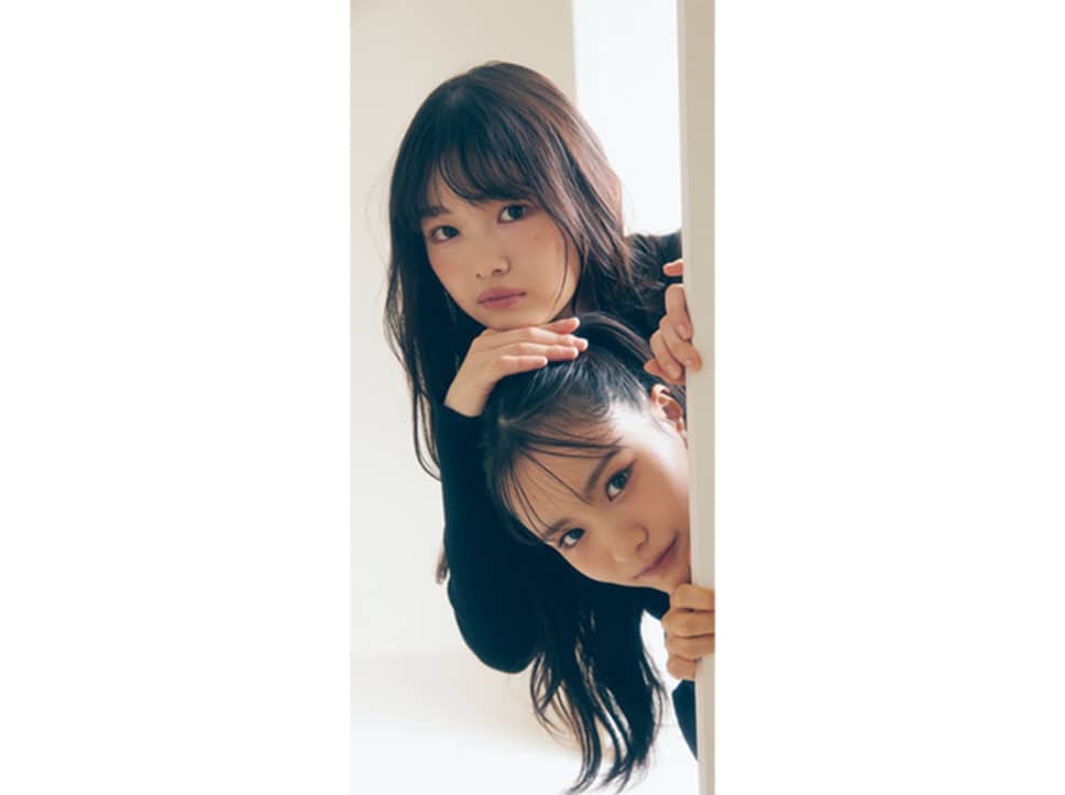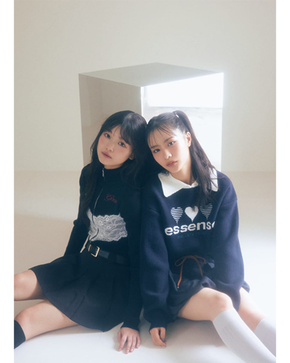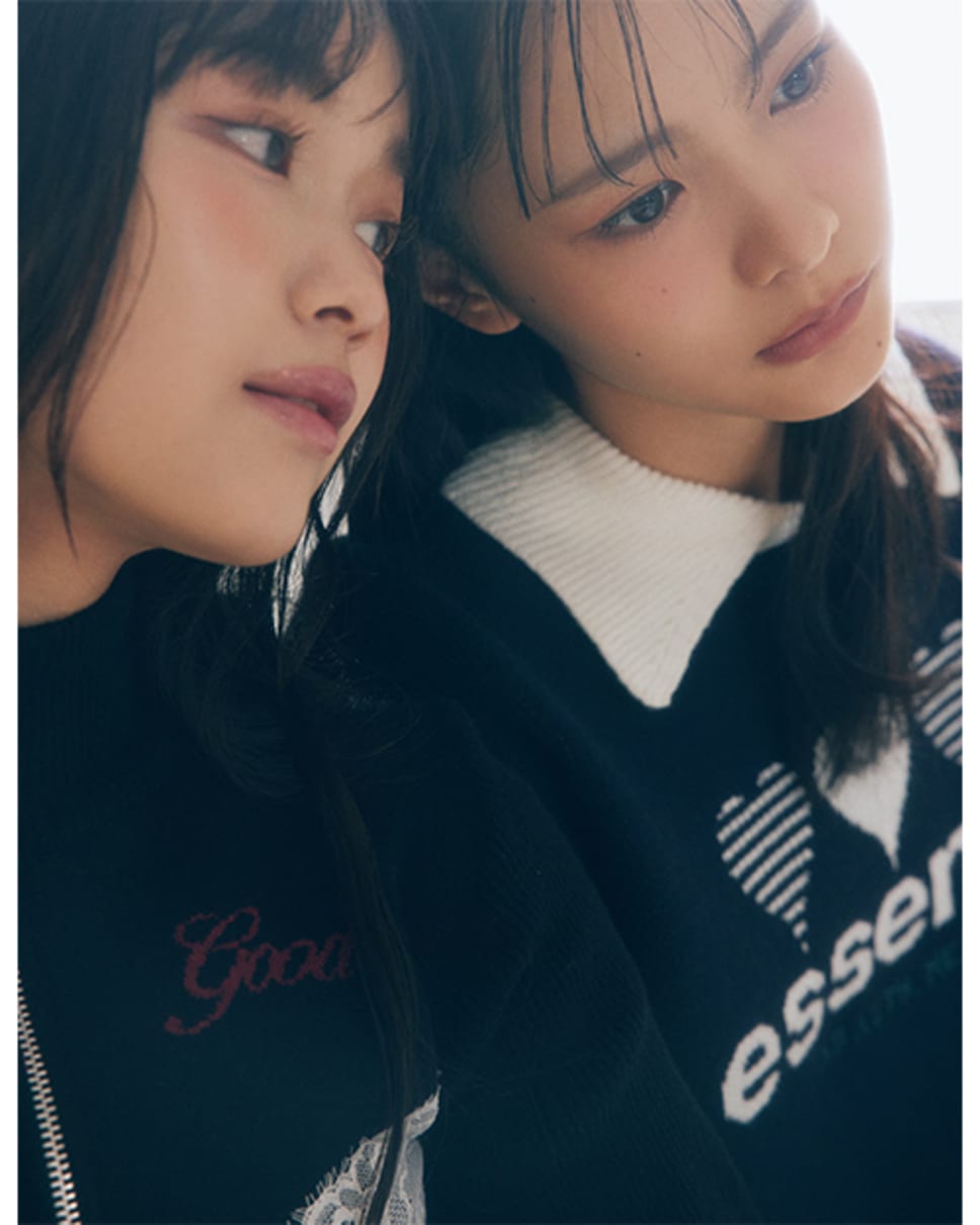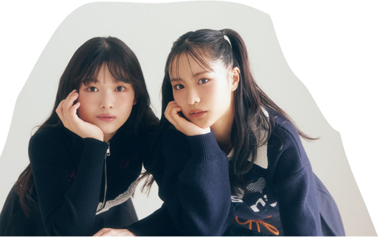 【左・山川宇衣】ロゴジップニット¥7920/jóuetie ルミネエスト新宿店 ベルト付きプリーツスカート¥14850/SNIDEL ルミネ新宿2店 【右・中川智尋】襟付きロゴニット¥7590/EMODAルミネエスト新宿 バルーンスカート¥10450/バロックジャパンリミテッド(MOUSSY) ソックス/スタイリスト私物 ●商品情報はViVi2025年11月号のものです。