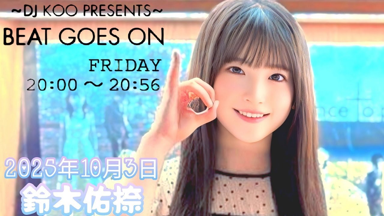 FM [音楽] 皆さんこんばんは。FMGDJ プレゼンズビトONTRFのDJこです。 この番組は若い人は流行ってる曲 大人詰めろそんな でどこまでも続いていく音楽をみんなで 楽しもうという番組です。 さあ、今週からこの番組にスペシャルなアシスタントが参加してくれます。自己紹介お願いです。 こんばんは。乃木坂46 期生鈴木ゆう奈です。 はい、よろしくお願いします。 よろしくお願いします。ます。 いやね、あのラジオのレキュラー初ということで はい。 それでビートオにお越しいただいて本当ありがとう。 ありがと。緊張します。 いや、緊張も全然しなくてやっぱりあの地元さですからね。もう山梨の方も含めてもう皆さんいろんな方が聞いてらっしゃるんでね、 楽しく行きましょう。 はい。はい。ありがとうございます。よろしくお願いします。ございます。 え、鈴木ナちゃんのことはですね、この後ゆっくりとご紹介していこうと思いますが、え、今までアシスタントを務めてくれた作家のゴージャス村上もいます。ちゃんといます。え、今回からゆうナちゃんが担当する前半をエメン [音楽] はい。 ゴージャス村上が担当する後半を美としてやっていきたいと思います。やっぱり一応 DJなんで、あの、レコードの、 あ、 レコード世代じゃないか。 はい。 レコードはあまり触れたことがなくて、まだ あのレコードアナログレコードの A面とB面があってをもじって今回 A面ユナちゃんでB 面をゴージャすっていうことでやっていきたいと思います。 はい。ありがとうございます。はい、 よろしくお願いしますね。 よろしくお願いします。 はい。FMフDJ コプレゼンツギトゴーズオ。今夜はこの曲からスタートです。 TRFでボイミかプレゼン FMフコプレゼ DJコ 乃木坂46 の鈴木優雅がお送りしています。 FMフジDJコープ プレゼンツビートゴーズオン うわあなんかめちゃめちゃ新鮮だまでのなんか感じもいいんだけど僕してていやゆうナちゃんがなんかアシスタントでもうこのタイトルを言ってくれただけでなんかねちょっとメロいっすね。 [笑い] [音楽] メロいですか? めちゃめちゃメロいっすね。 ありがとうございます。はい。 はい。 え、今週は、え、鈴木ゆうナちゃんのことをね、色々とご紹介していきたいと思いますが、よろしくお願いします。 はい、よろしくお願いします。 うん。 なんて呼ぼうかなと思ってお互い。 あ、確かに 普通にゆうナちゃんでいいのかな? はい。私はそうですね、なんか公式ではゆうナちゃんなんですけど、ま、ある番組でゆうちゃんっていうあだ名をつけていただいて うん。ゆ、 ゆうちゃんです。 ゆうちゃん。 はい。 アクセントがちょっと違うの? そうなんです。ゆうちゃんなんですよ。 それはどういうことでゆうちゃんに もう実は最近あの鹿児島県出身の 6 期生の瀬戸口みちゃんがちょっとるんですけど鹿児島弁のがちょっと出ちゃうってことね。 それでゆうちゃんっていう呼び方になった。 なるほど。え、さすがにゆうちゃんだとあの僕のイントネーションはもうゆうちゃんなんで [音楽] でもやっぱりゆうナちゃんかな。 はい。 お願いします。 はい、お願いします。 私は こさんでいる。 こさんてんでも大丈夫です。はい。 お願いします。 お願いします。あのちょっと今日はね色々とあのプロフィール紹介みたいな感じで、え、ゲストではないんだけども、あの、僕から色々と質問させていただきます。 ありがとうございます。 え、ちょっとまだね、あの、初めて聞く方もね、いらっしゃるかもしれないんで、え、アイドルに [音楽] なろうと思ったきっかけとかは はい。ま、正式に言うと私は はい。 アイドルになるというよりは乃木坂 46が大好きで 乃木坂になりたくてというか なるほど。はい。 オーディションを受けました。うん。うん。 はい。 え、 でも それがいつ頃の感じと高校 3年生の夏ですね。 はい。 え、それまではやっぱり習い事つったら変だけど、そういうことをやってたんですか? はい。習い事。歌も踊りも未経験で習い事は本当に初動とか うん。初動 初動とか作道とかそういう え、作道もやってたんだ。 はい。 どう道を極めてるね。じゃあね。 あ、そうですね。なんかわ、日本文化がすごく好きで。 あ、そうなんだ。 なので歌もダンスも全然未経験だったんですけど うん。で、え、オーディション受けて もじゃあアイドルが好きというよりも乃木坂っていう感じだった。 はい。乃木坂が大好きでも乃木坂にすごいずっとなりたかったというよりは、ま、一種の挑戦のような感じで うん。19 歳でその次も受けられない年齢だったので はい。 最後のチャンスじゃないですけど はい。 え、ちなみに憧れの先輩とかはいらっしゃいますか? [音楽] はい。え、梅沢南さんです。 なるほどね。 はい。 え、どういうところがやっぱりここは もう、ま、全てにおいて うん。トップオブトップというか表でも裏でもキラキラしてて、 [笑い] どこを見ても 本当に抜けのな